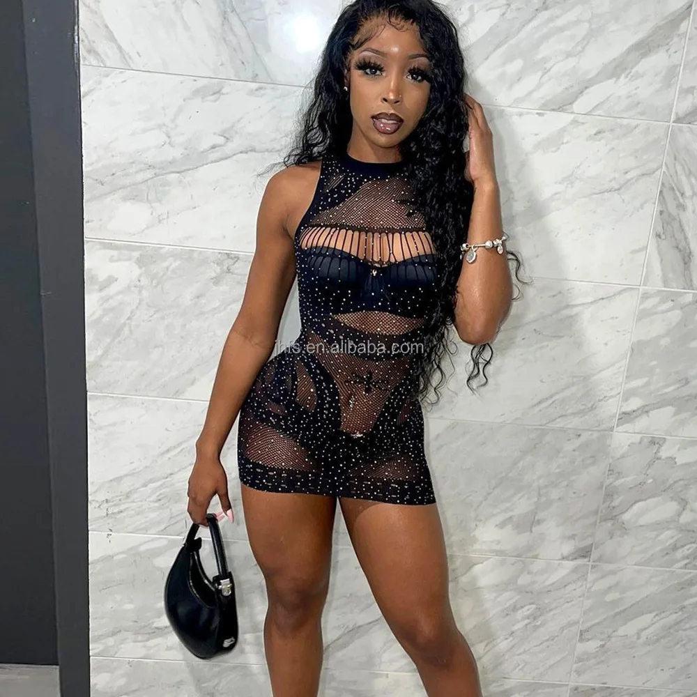 J&H Sexy Party Club Hot Diamond Velvet Patchwork Mesh Perspective Bag Buttocks Strap Short Mini Skirt Dress