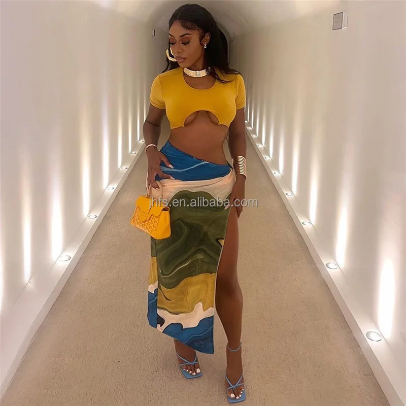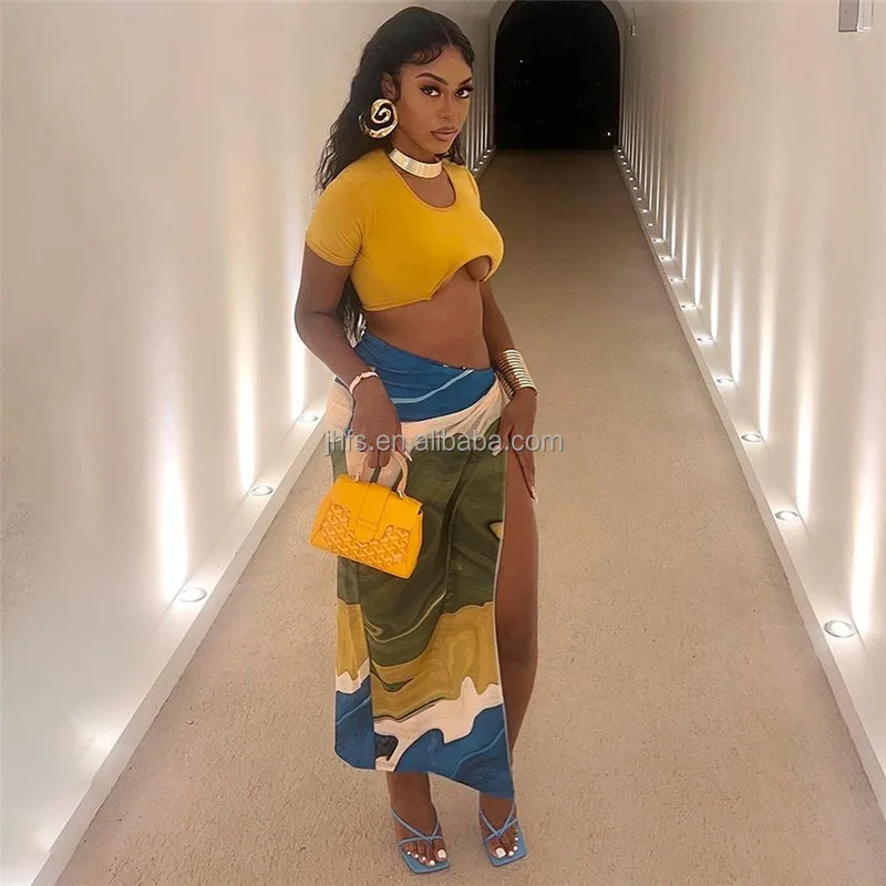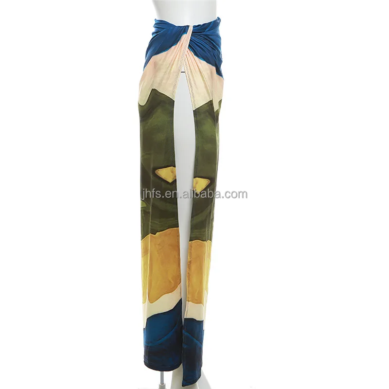 J&H Women Autumn New Style Contrast Color Print Long Side Split Sexy Women's Skit Fashion Midi Dress For Ladies