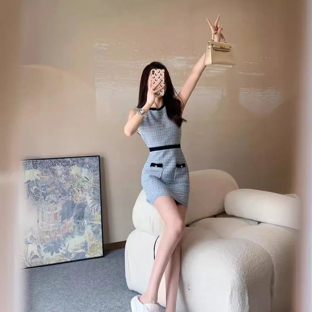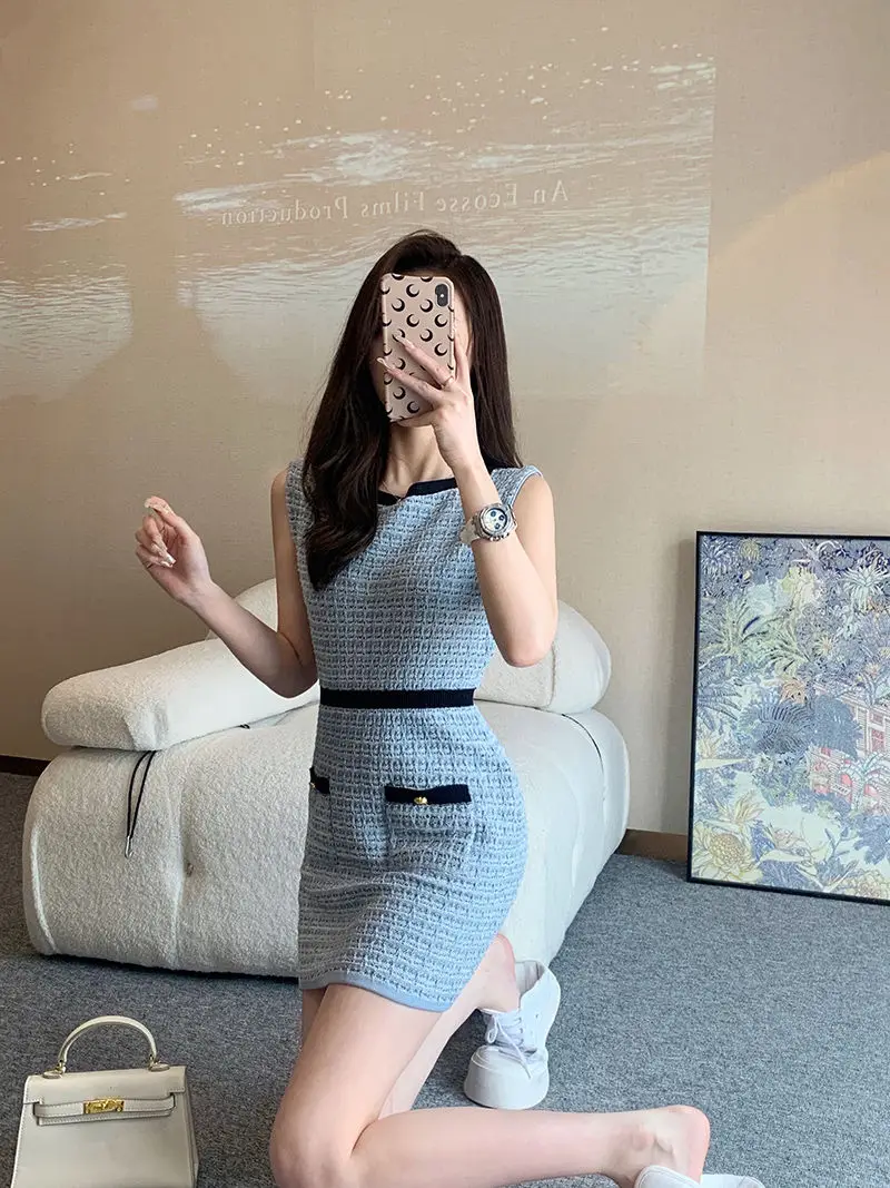 Knitted dress women's 2024 new French simple contrast knitted vest temperament advanced sense of waist slimming bag hip skirt
