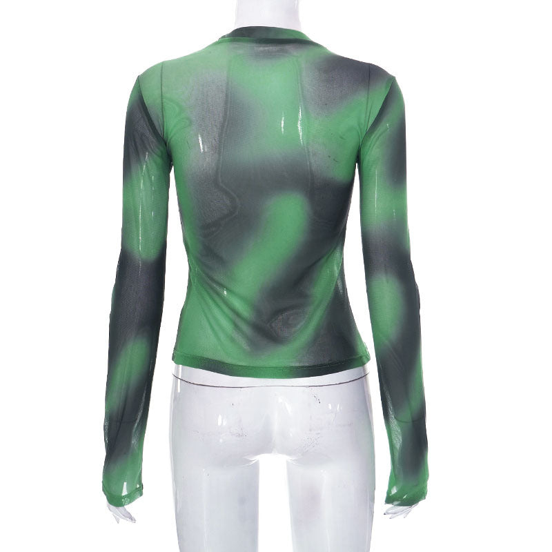 KS064 Gradual tie dye t shirt mesh print slim long sleeve crop top female 2023