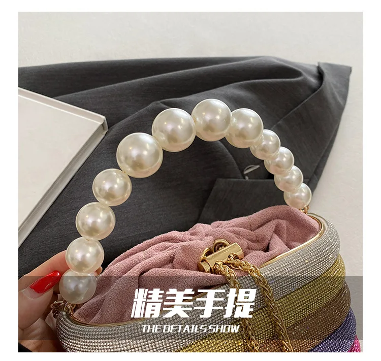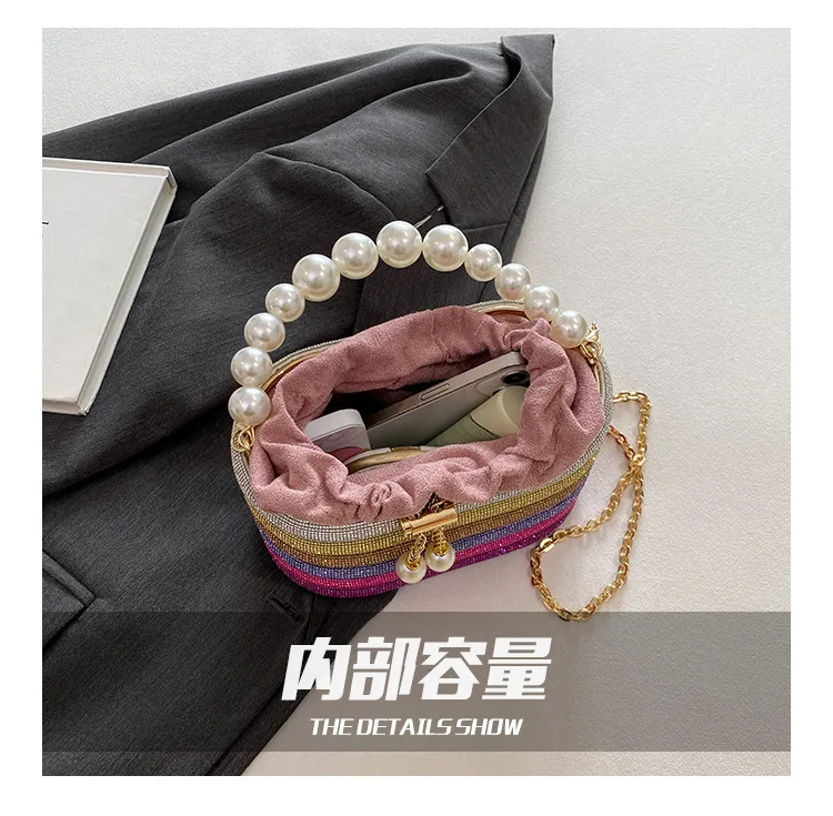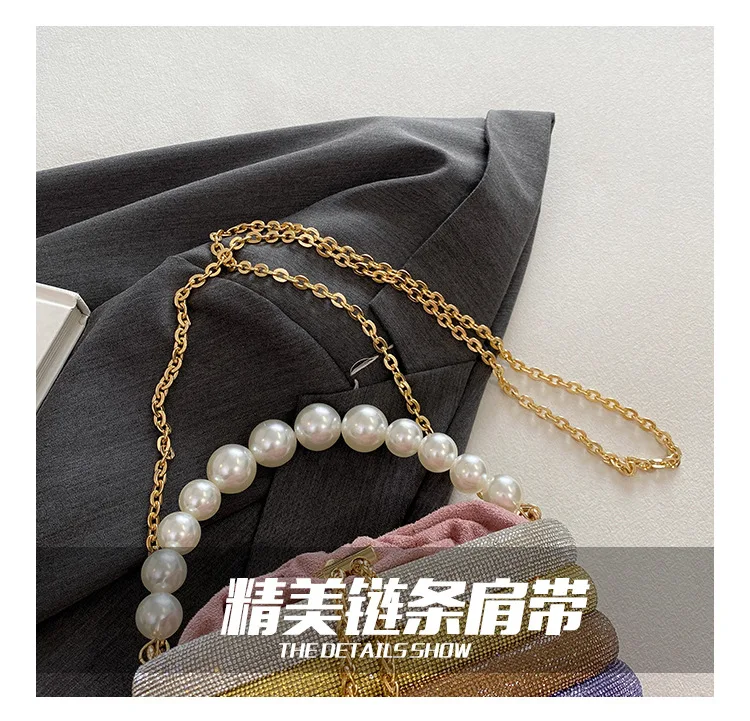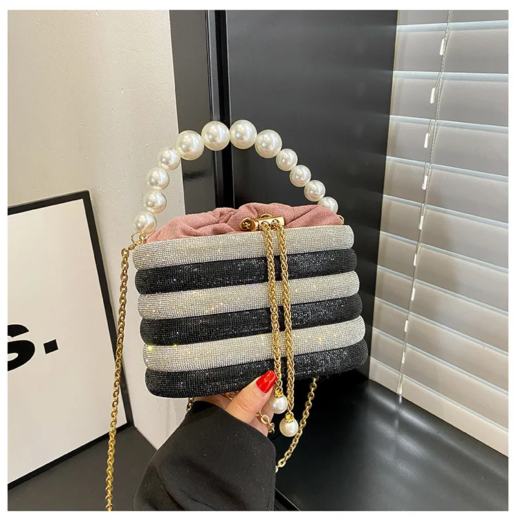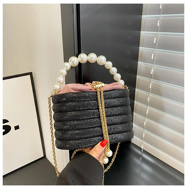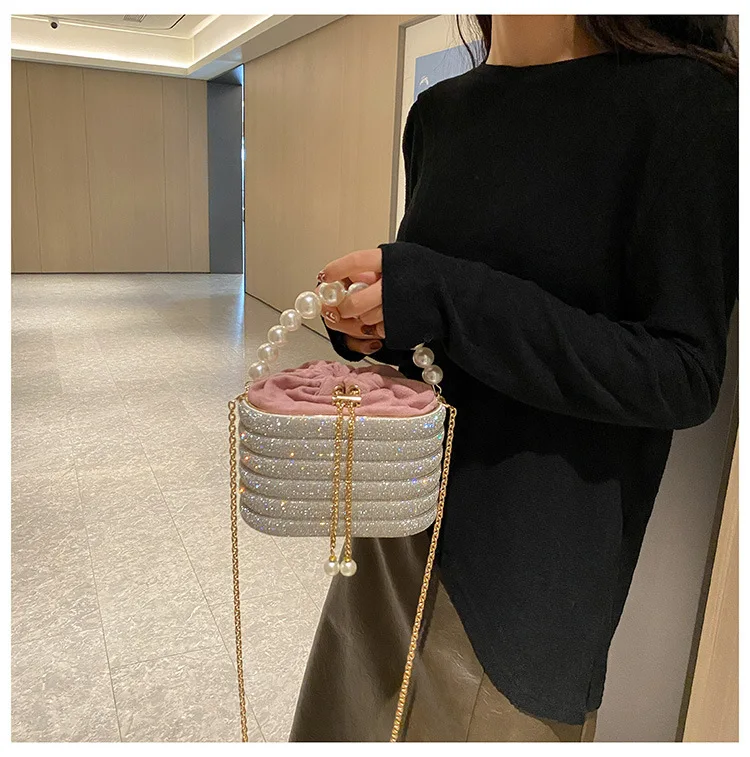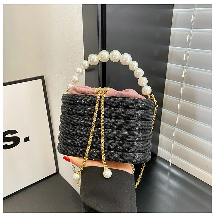 Luxury Satin String Metal Cage Pearl Beaded Handle Handbag Glitter Shiny Diamonds Evening Bag Wedding Clutch Purse Crossbody Bag