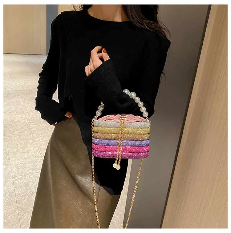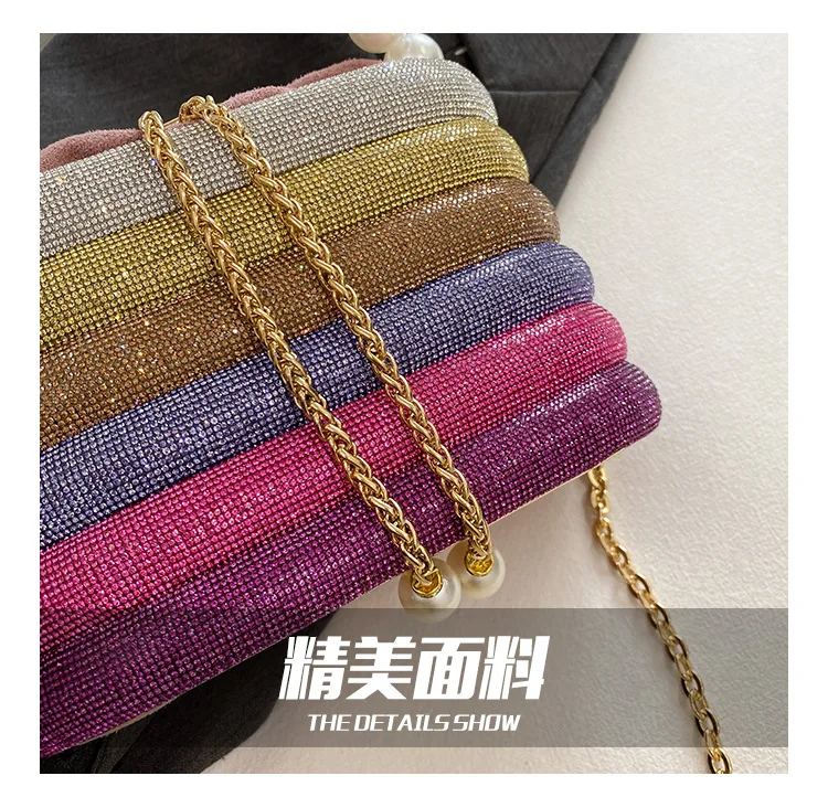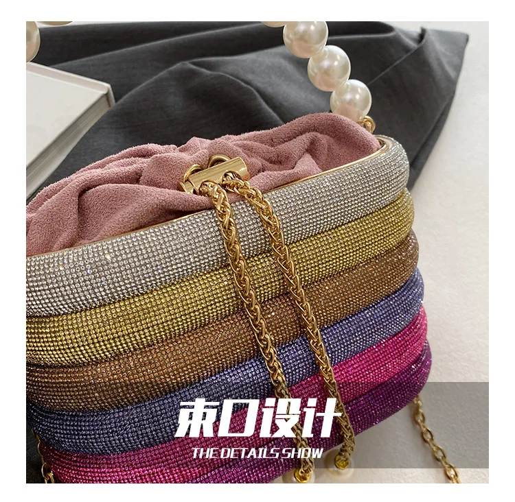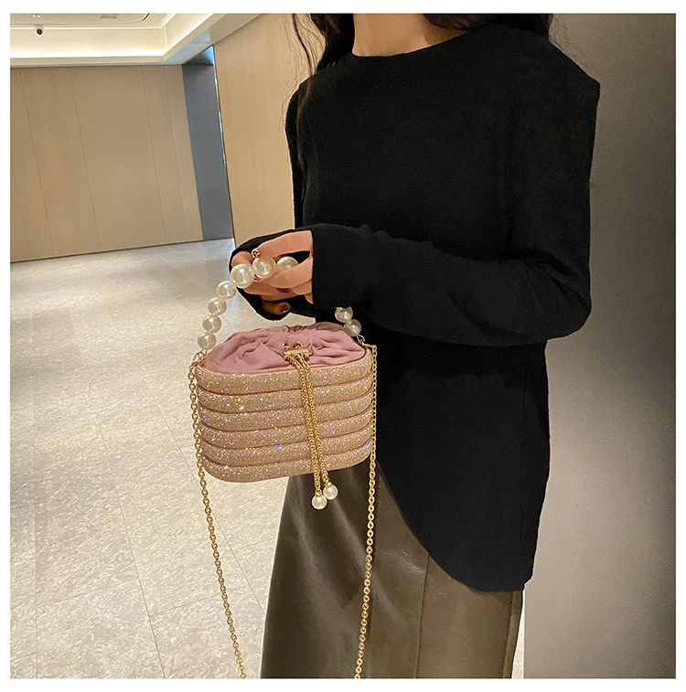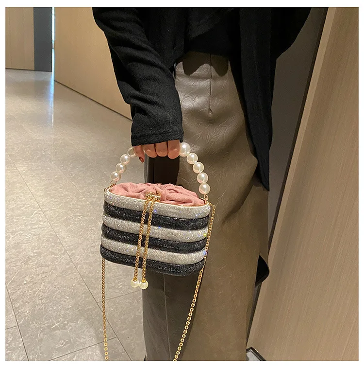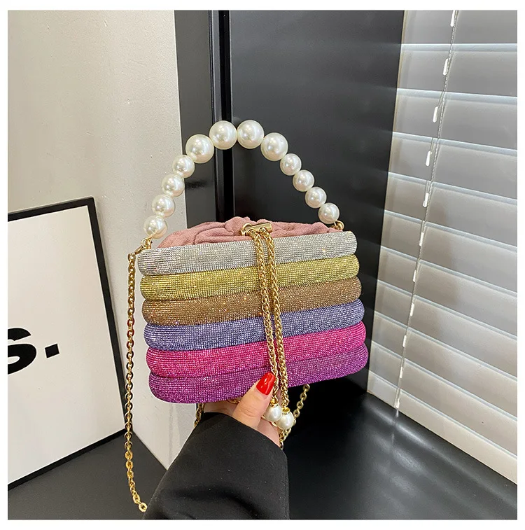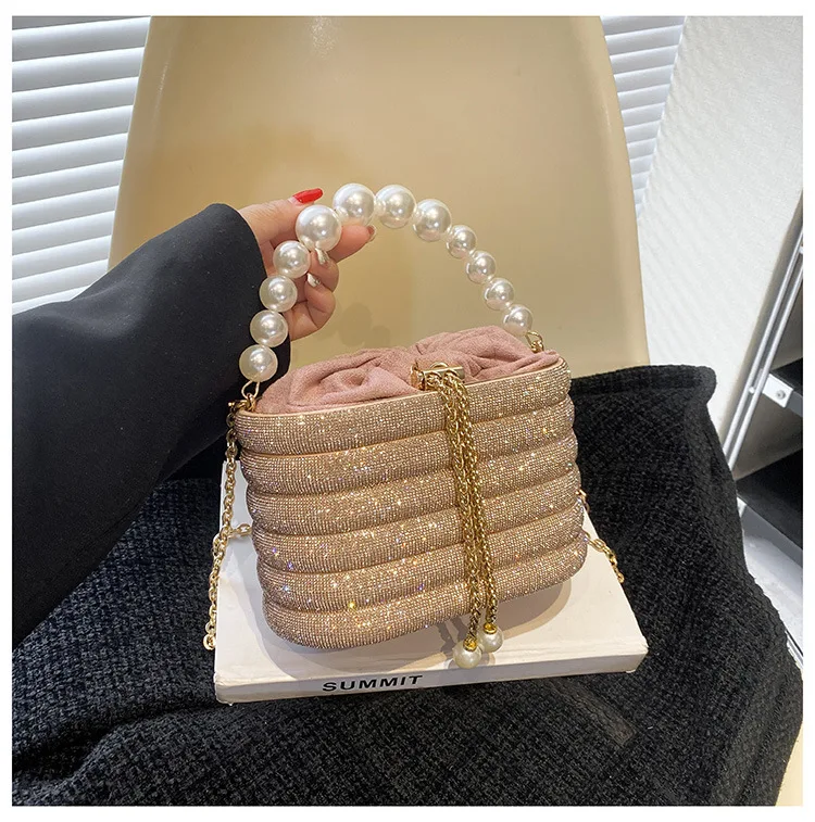 Luxury Satin String Metal Cage Pearl Beaded Handle Handbag Glitter Shiny Diamonds Evening Bag Wedding Clutch Purse Crossbody Bag