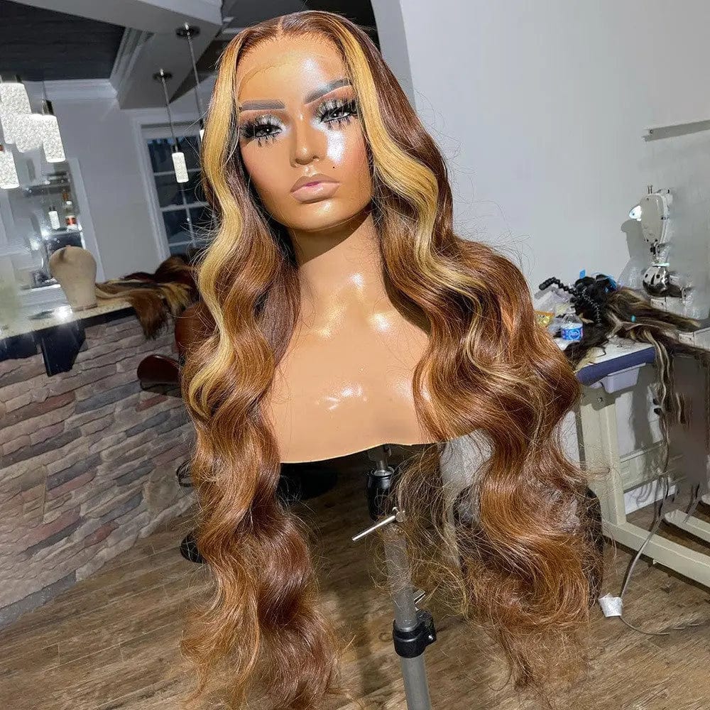 New Design Long Wavy Highlights Honey Brown Wigs Virgin Cuticle Aligned Hair 13*4 Lace front Wigs for Black Women