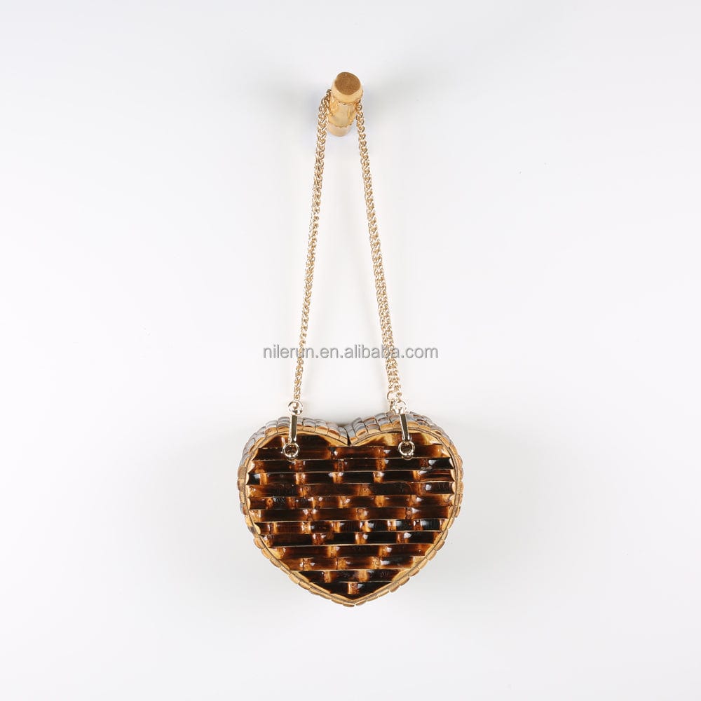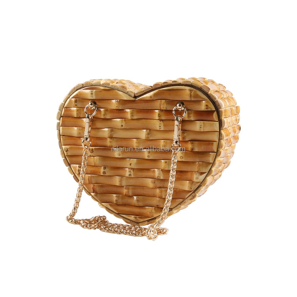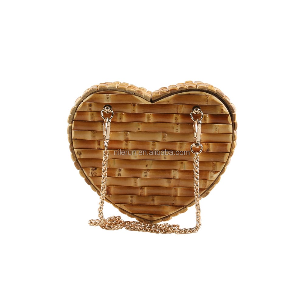 Nilerun Wood Rattan Straw Latest New Fashion Unique Handmade Cute Heart Shape Natural Bamboo Root Shoulder Bag Purse Handbag