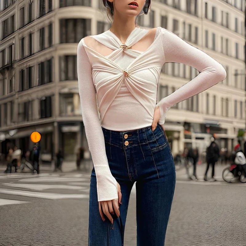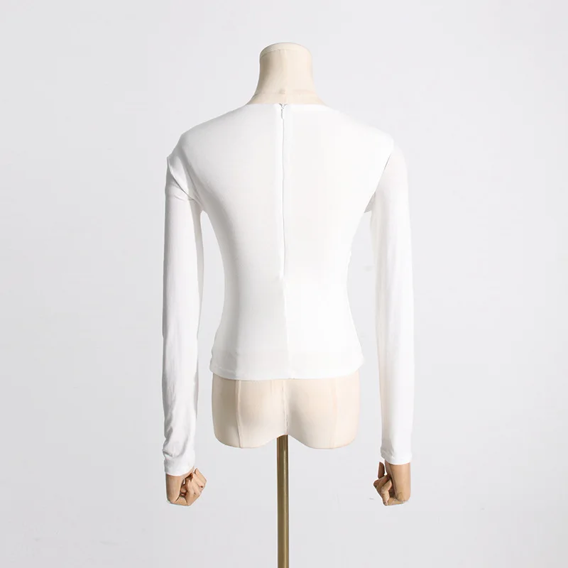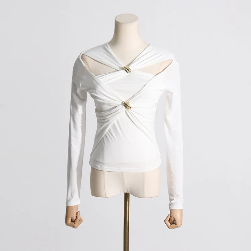 OUDINA 2024 Spring New Style Women's Tight Top Long Sleeve Hollow Twist Design Versatile Slim Female Tops And T-shirt