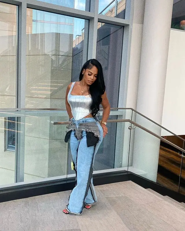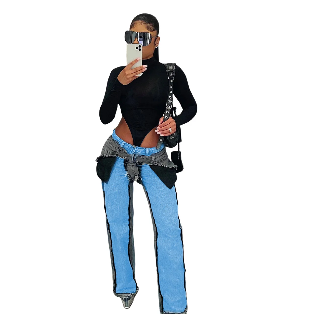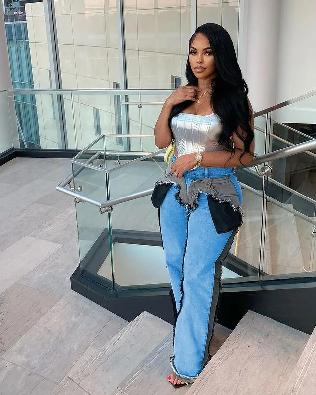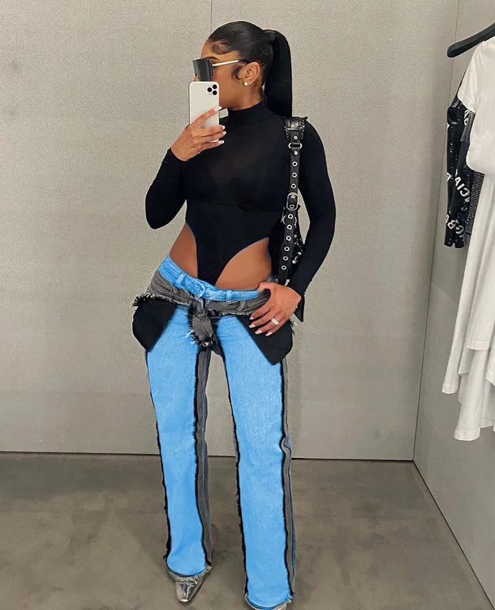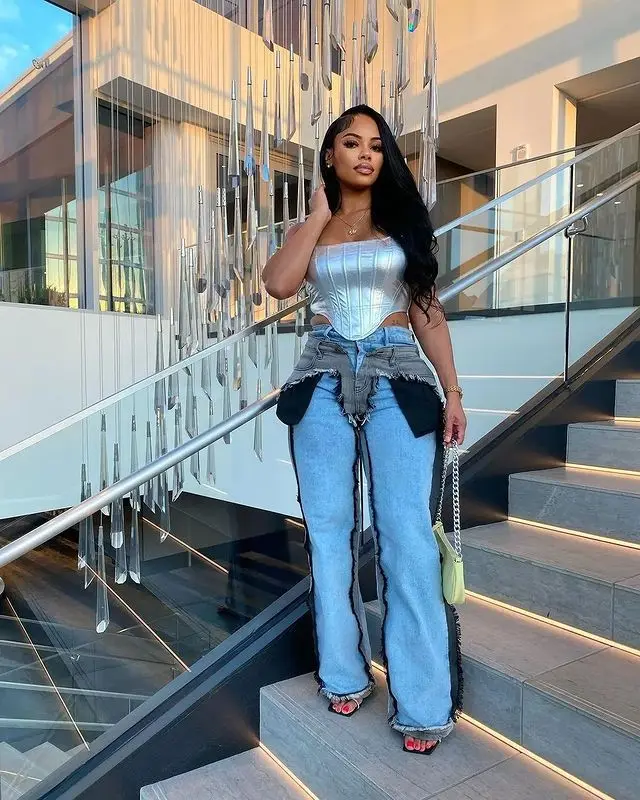 OUDINA Fashion Latest Design Stretch Patchwork Wash Denim Wide Leg Women Pants Baggy Jeans