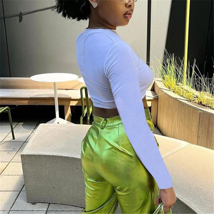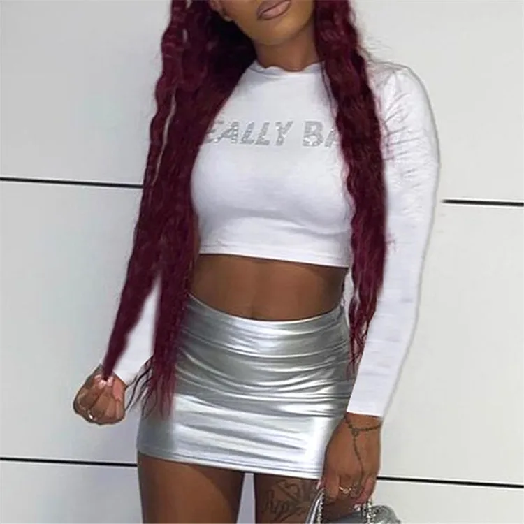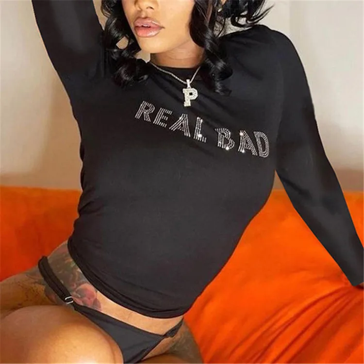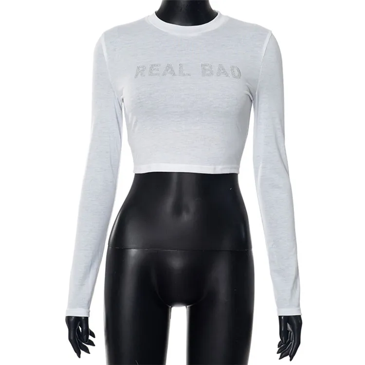 Rhinestone Letters Slim Crop Tops Women Hipster Sexy O-Neck Long Sleeve T-Shirts 2024 Spring Graphic Tees