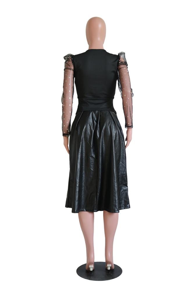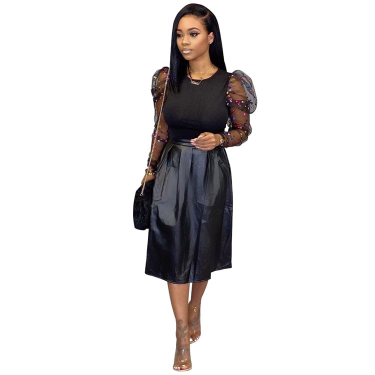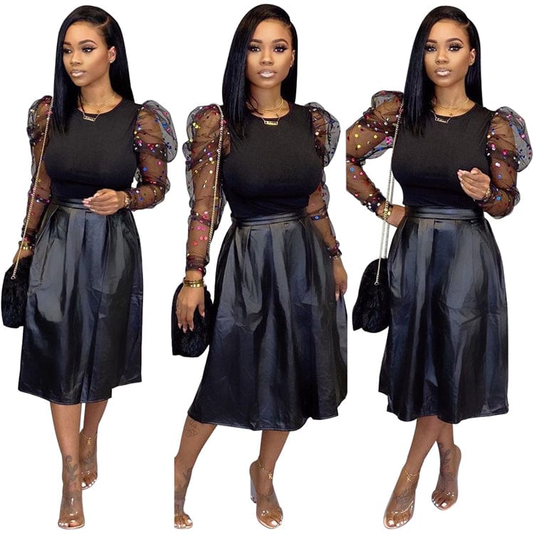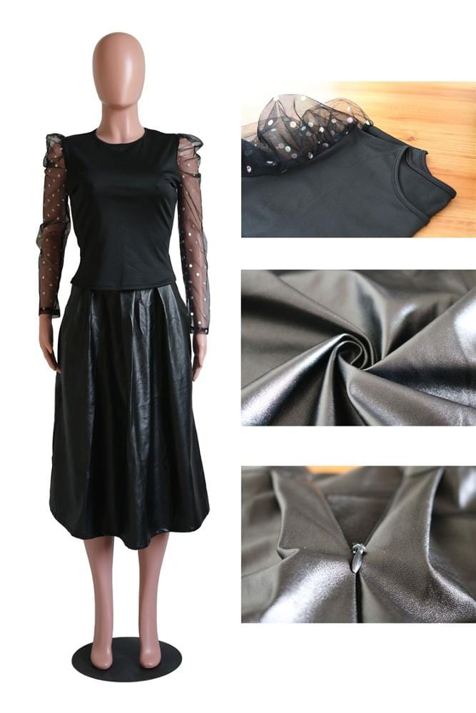 S216 newest long sleeve sequined shirt with pu leather long skirt two piece set women clothing