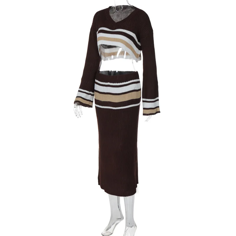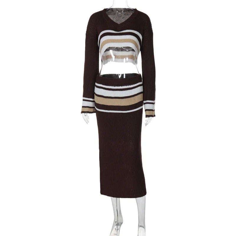 S3914101w Knitting O Neck Striped Long Sleeve High Waist Crop Top Tube Skirt Women's Sets Winter Y2k Dropshipping Casual Clothes