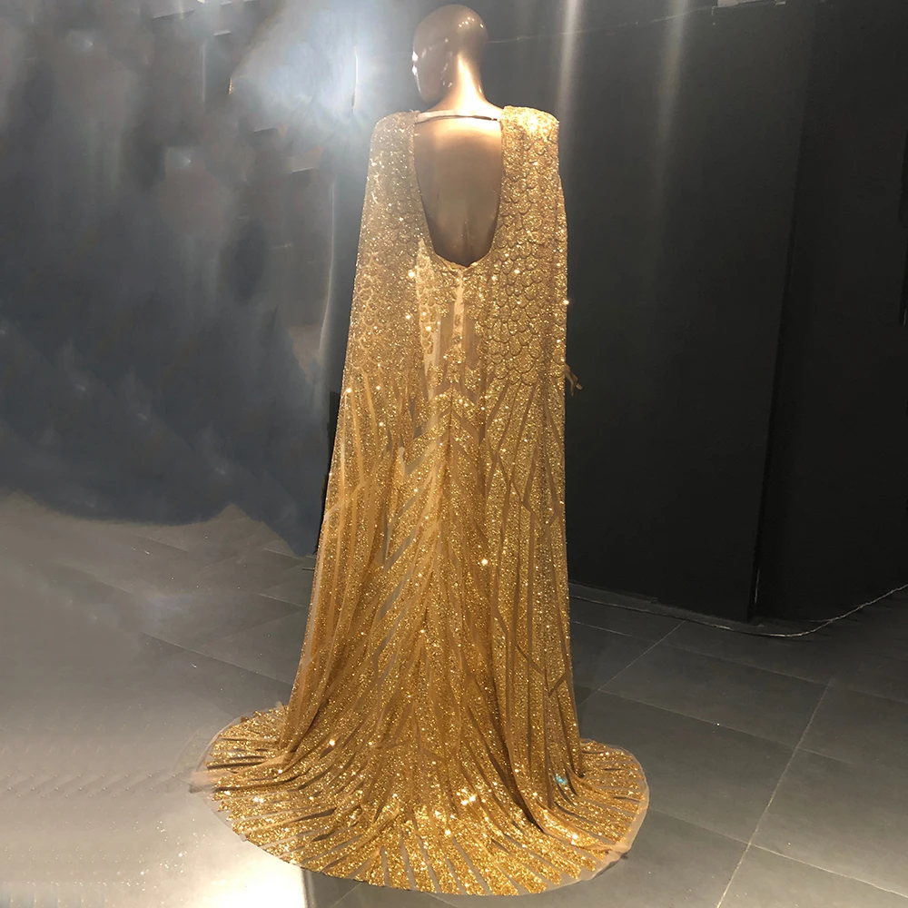 Scz050-2 Luxury Gold Dubai Evening Dresses With Cape Sparkly Beaded Elegant Long Formal Party Dress For Women Wedding