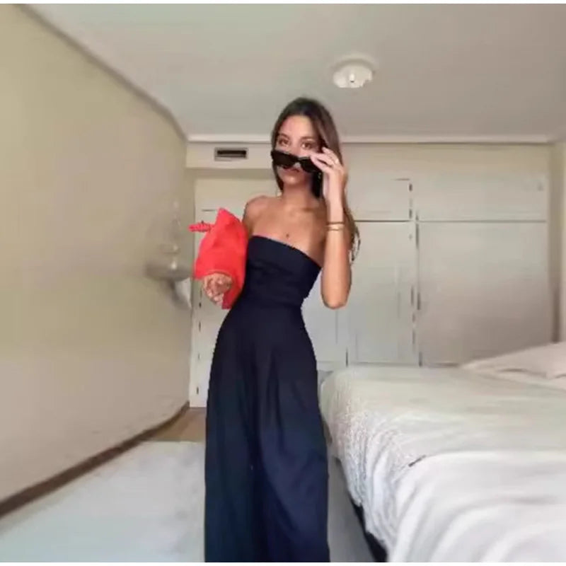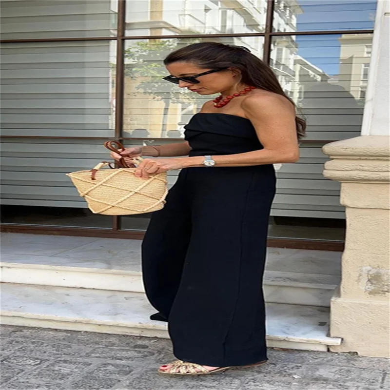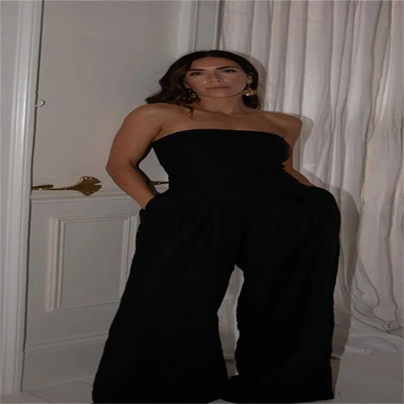 Sexy Backless Women's Jumpsuits Solid Off Shoulder Waist Cinching Pockets Wide Leg Pants Lady Bodysuit Summer Female Outwears