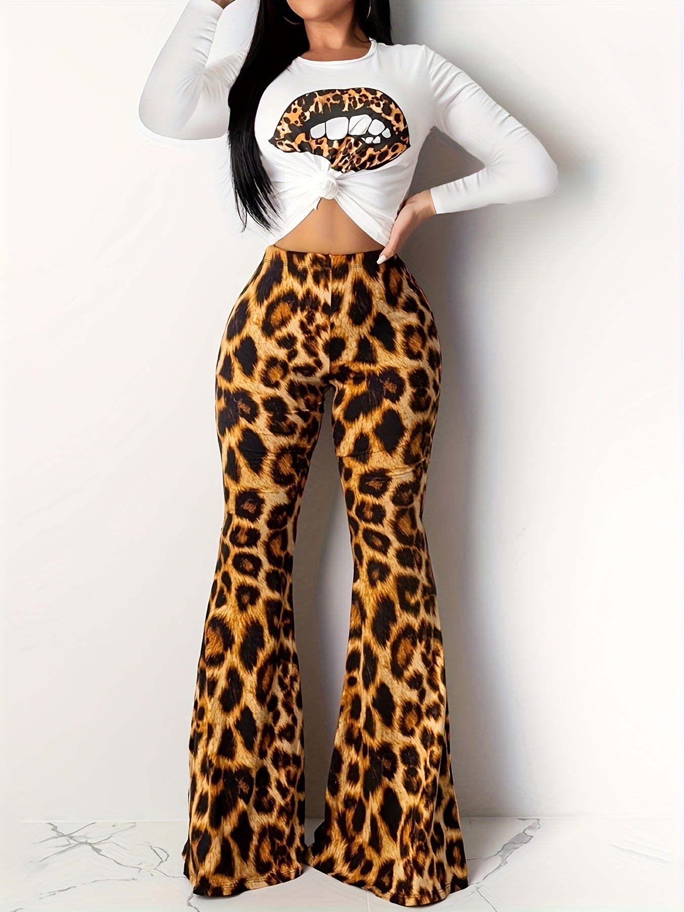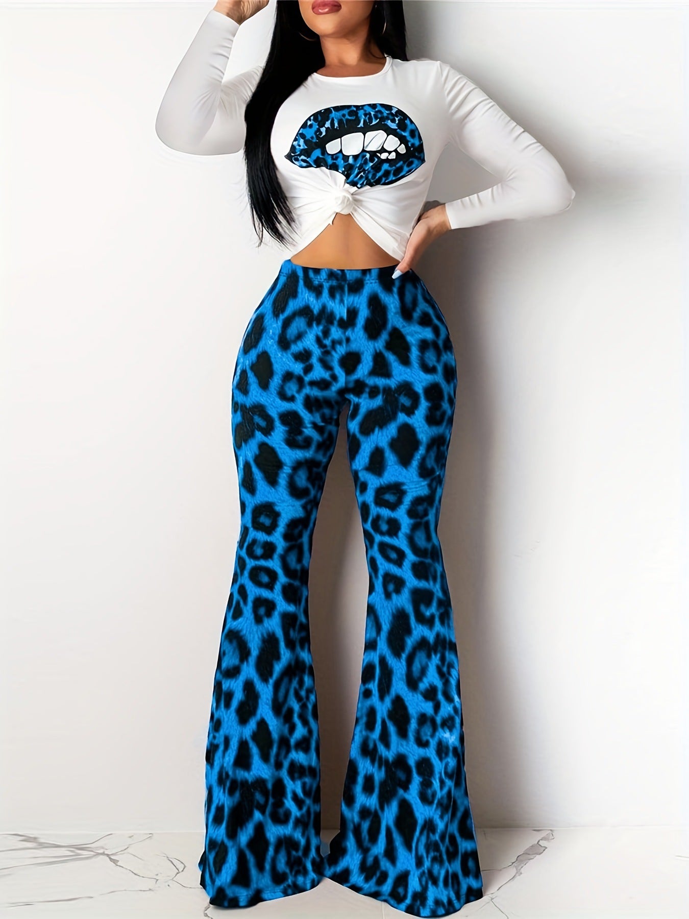Sexy leopard print lip print set 5XL flare trouser with short top suit street wear plus size women clothing 2 piece