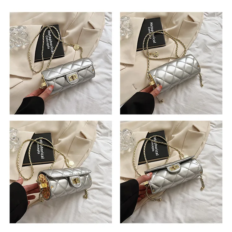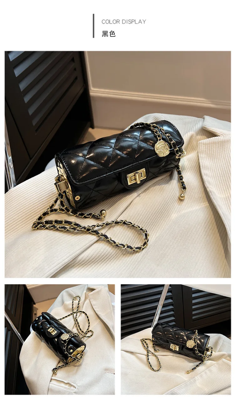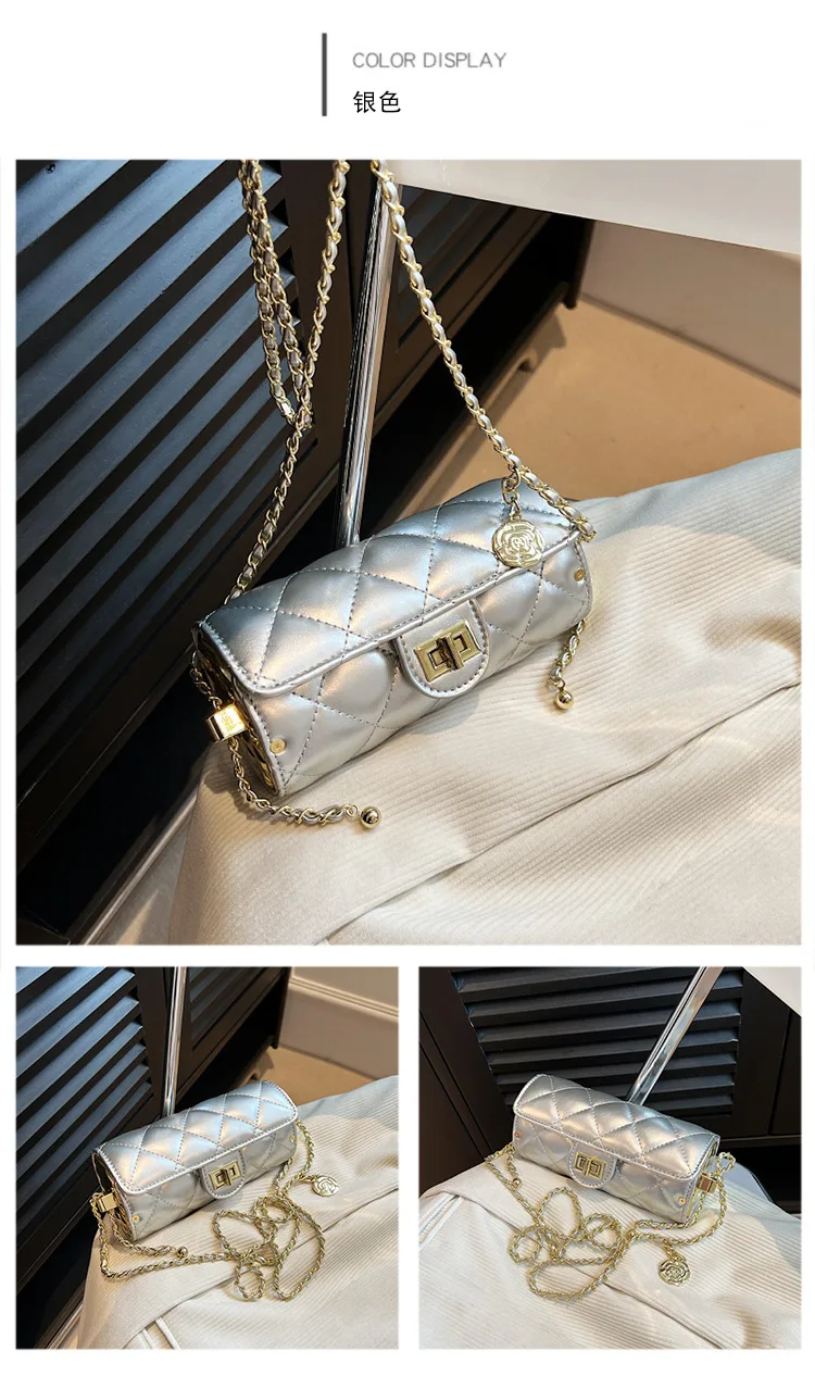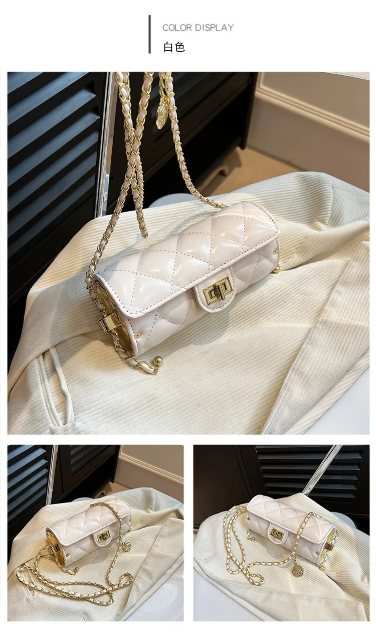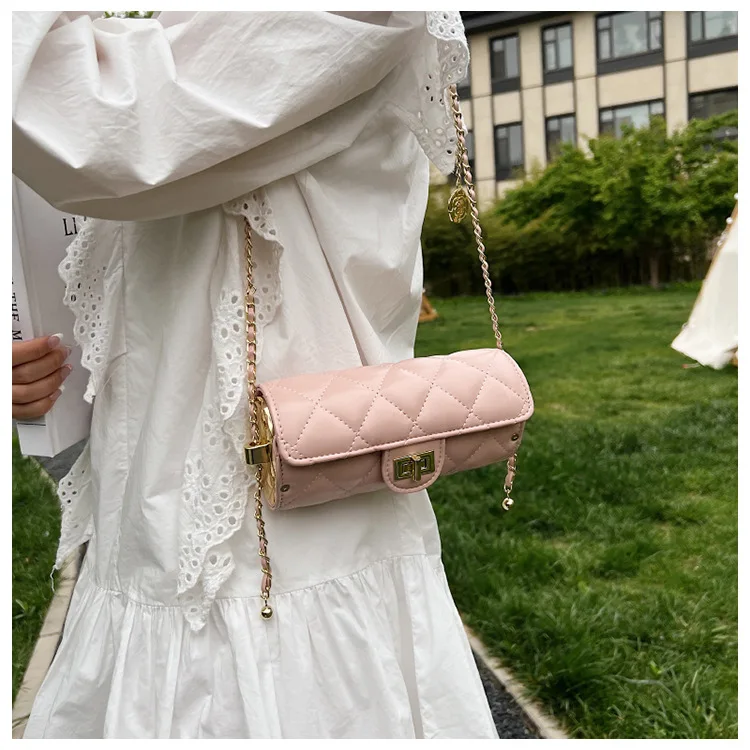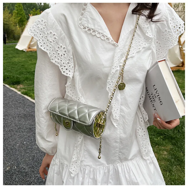 Small Barrel Shaped Shoulder Bag For Women 2023 Diamond Lattice Round Handbag Purse Casual Crossbody Bag Camellia Pu Leather Bag