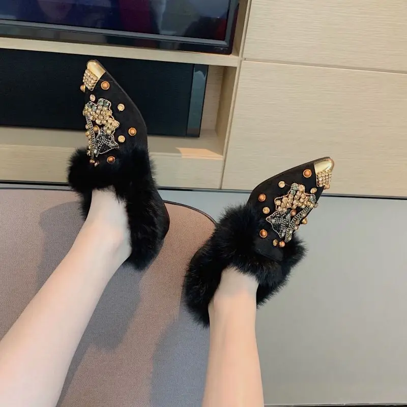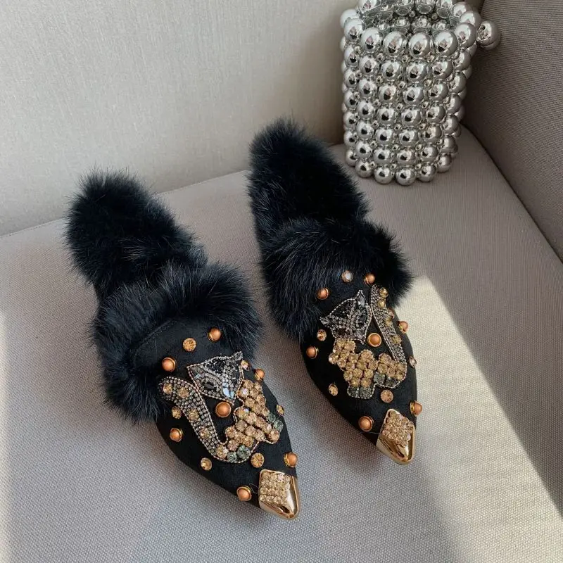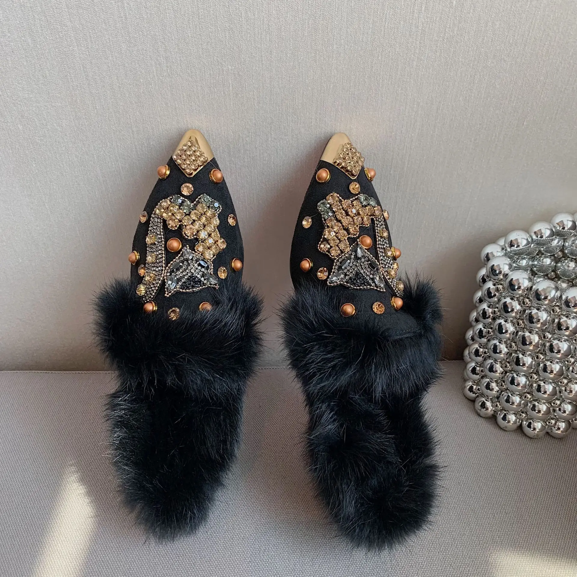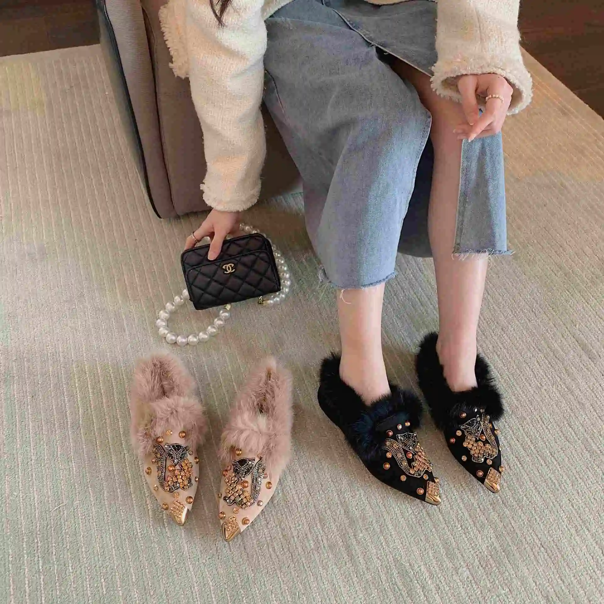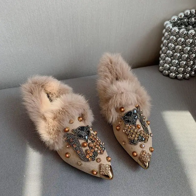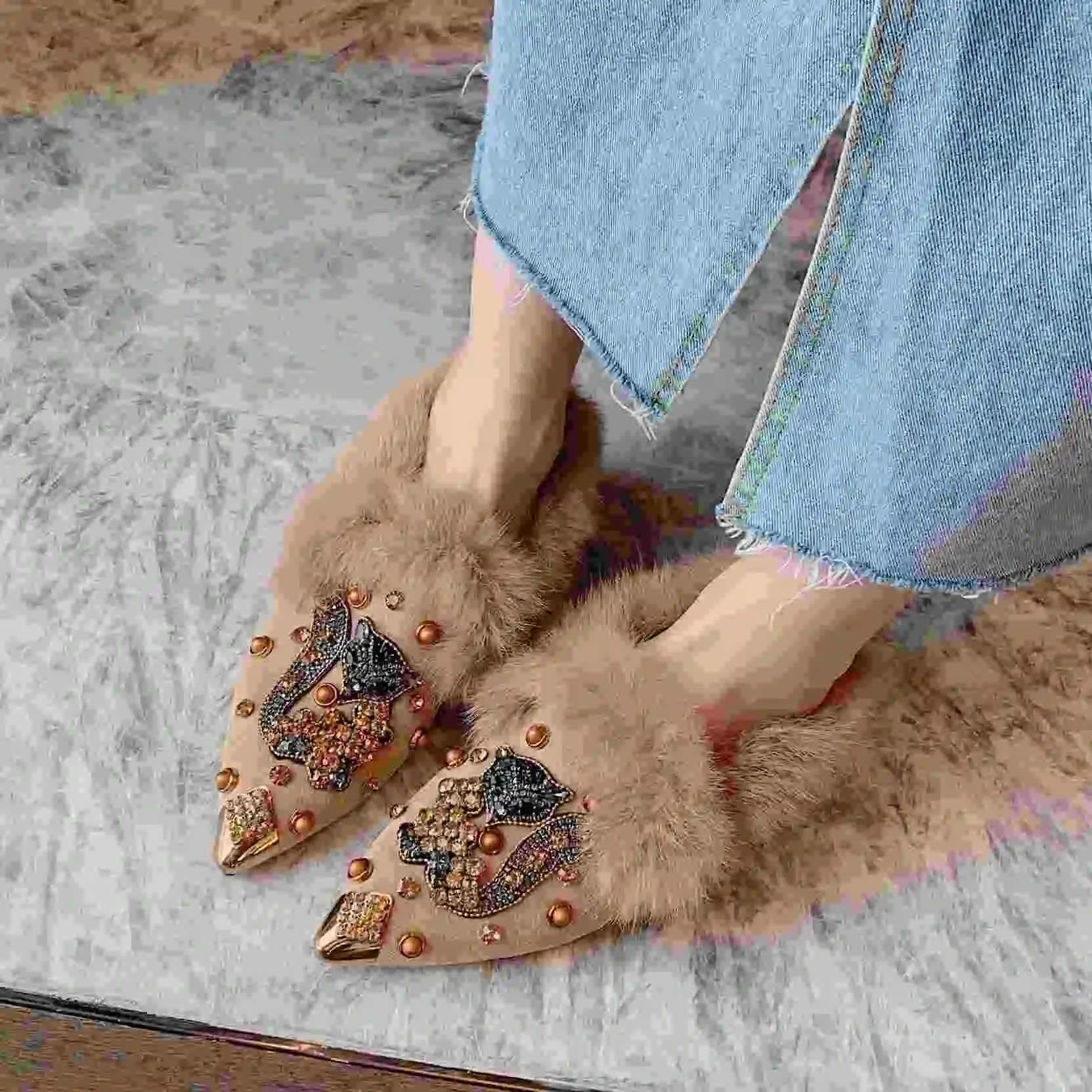 Suede Furry Inside Casual Outdoor Slippers Closed Toe Female Women Loafer Flat shoes with Diamonds