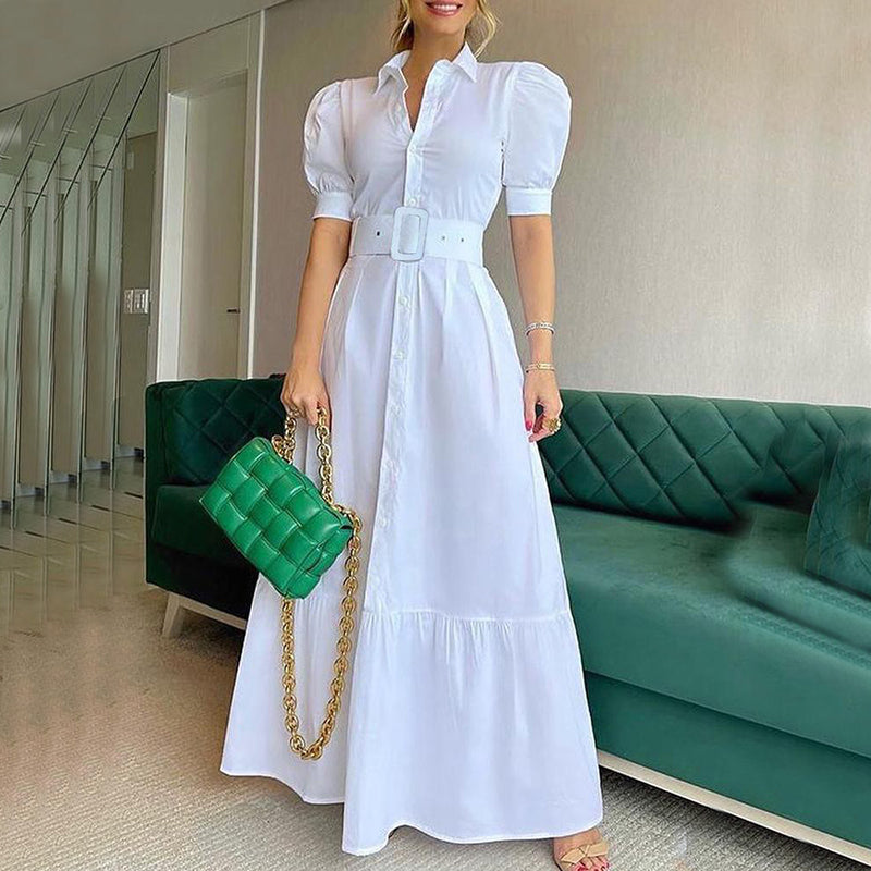 Summer Elegant Turn Down Collar Stripe Print Shirts Maxi Dress With Belt Casual Women Puff Sleeve Long Dresses