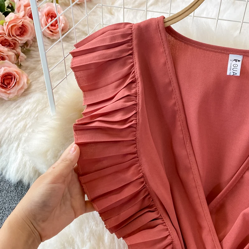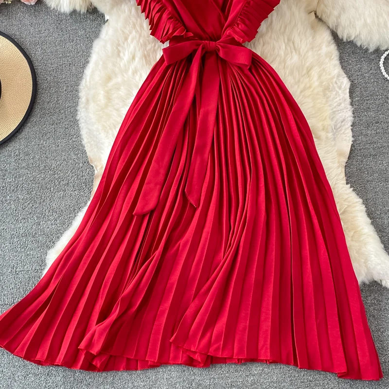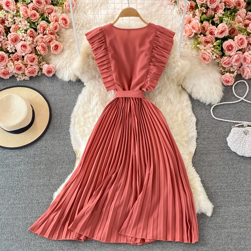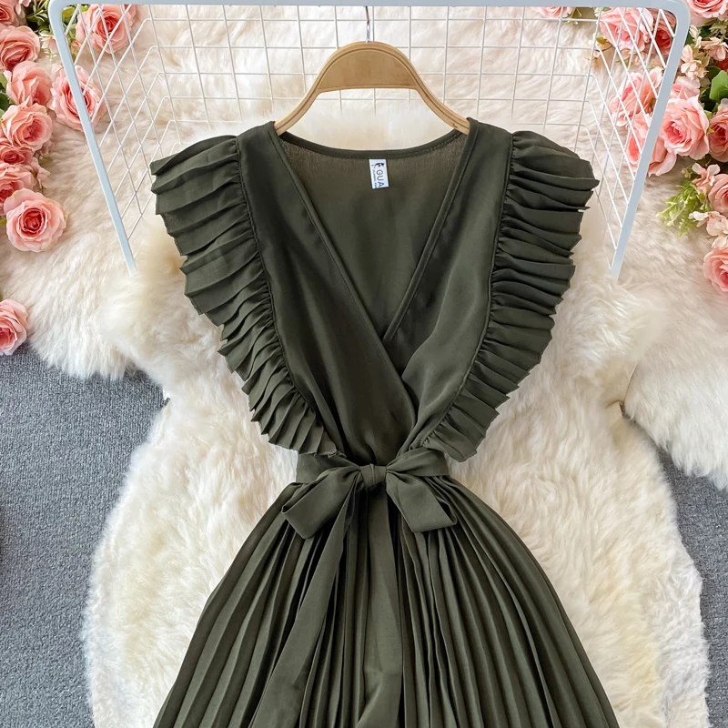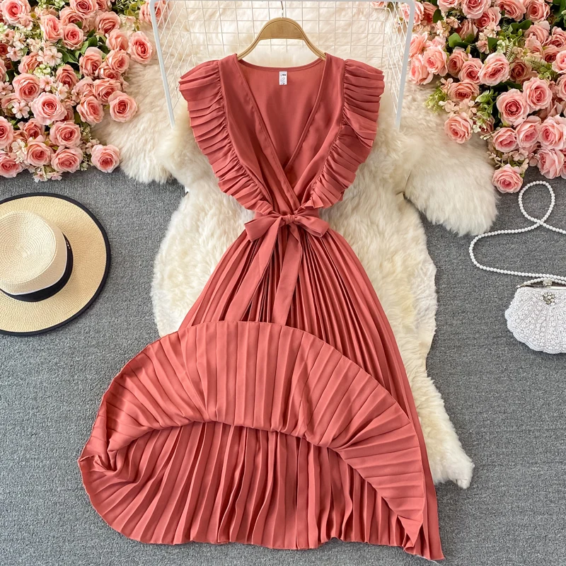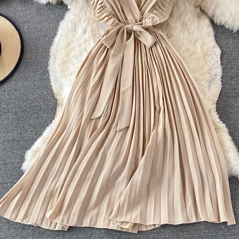 Summer Hepburn Style Women Dress Ruffles Sashes Chiffon Fashion Elegant Pleated V-neck Dresses for Ladies Casual Vintage Vestido
