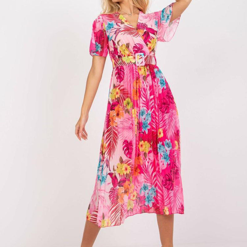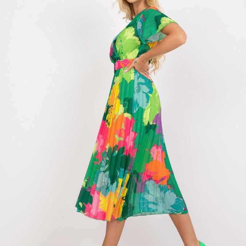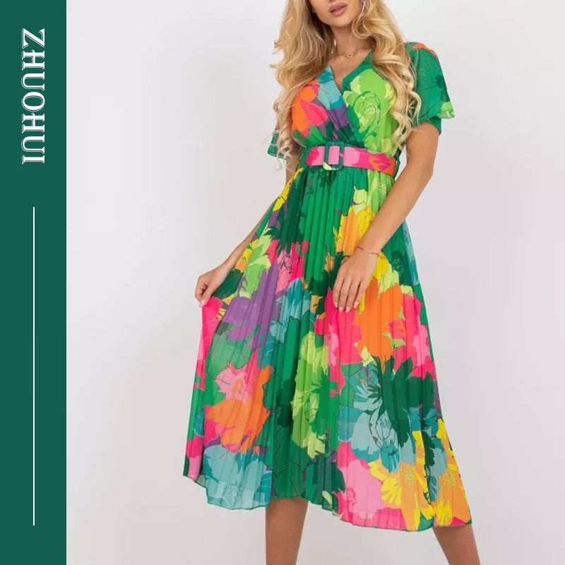 Summer Sweet V Neck Flare Sleeve Allover Pleated Swing Dress Women Elegant Ruched With Belt Holiday Dresses Ladies