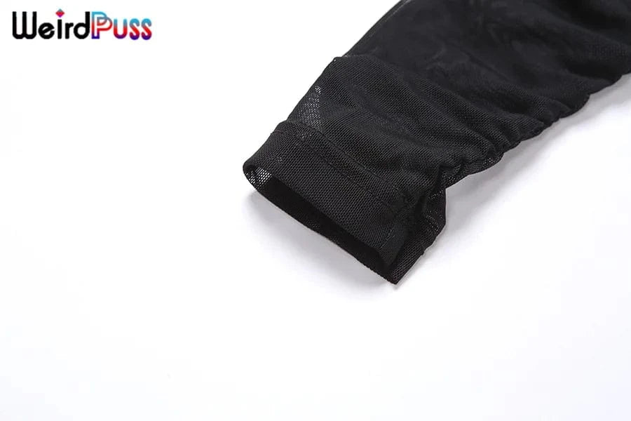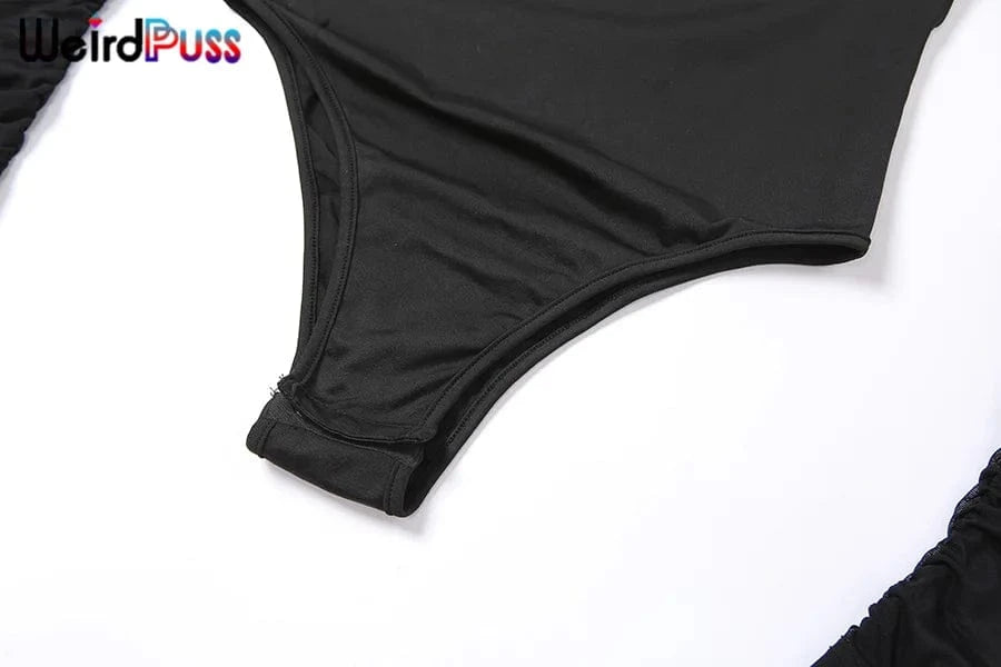 Weird Puss 2023 Mesh Patchwork Bodysuit Sexy Women Sleeve Ruched Skinny Turtleneck Bodycon Elegant Wild Tops Streetwear Outfits