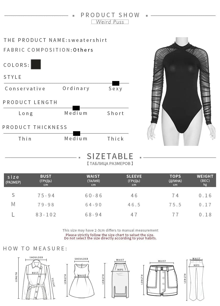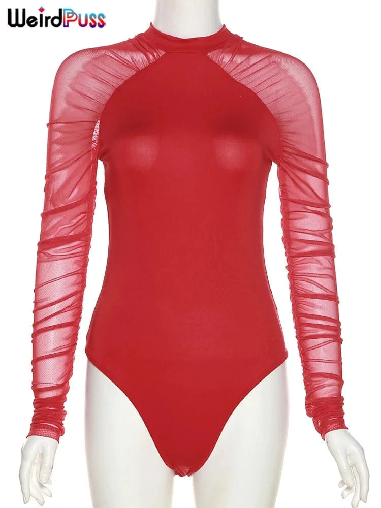 Weird Puss 2025 Mesh Patchwork Bodysuit Sexy Women Sleeve Ruched Skinny Turtleneck Bodycon Elegant Wild Tops Streetwear Outfits