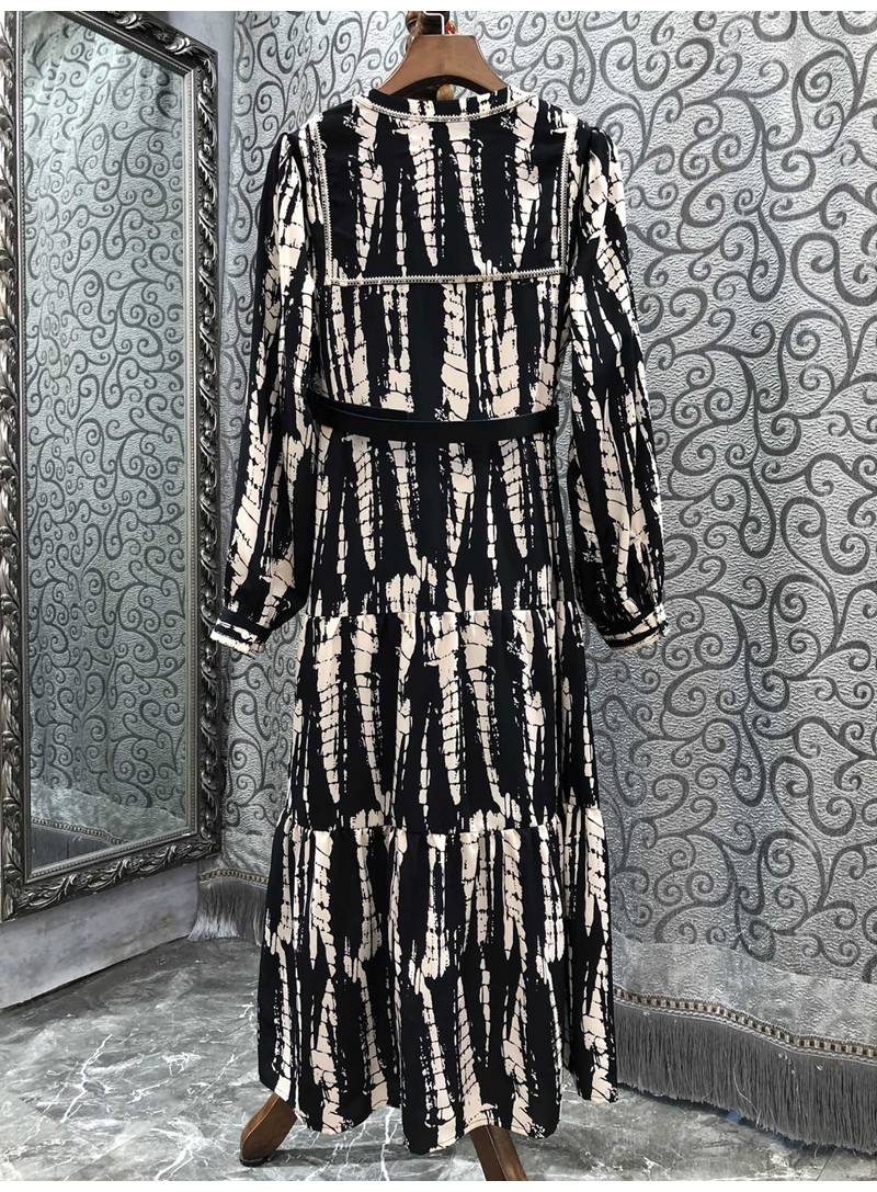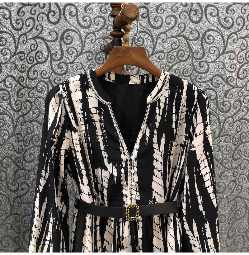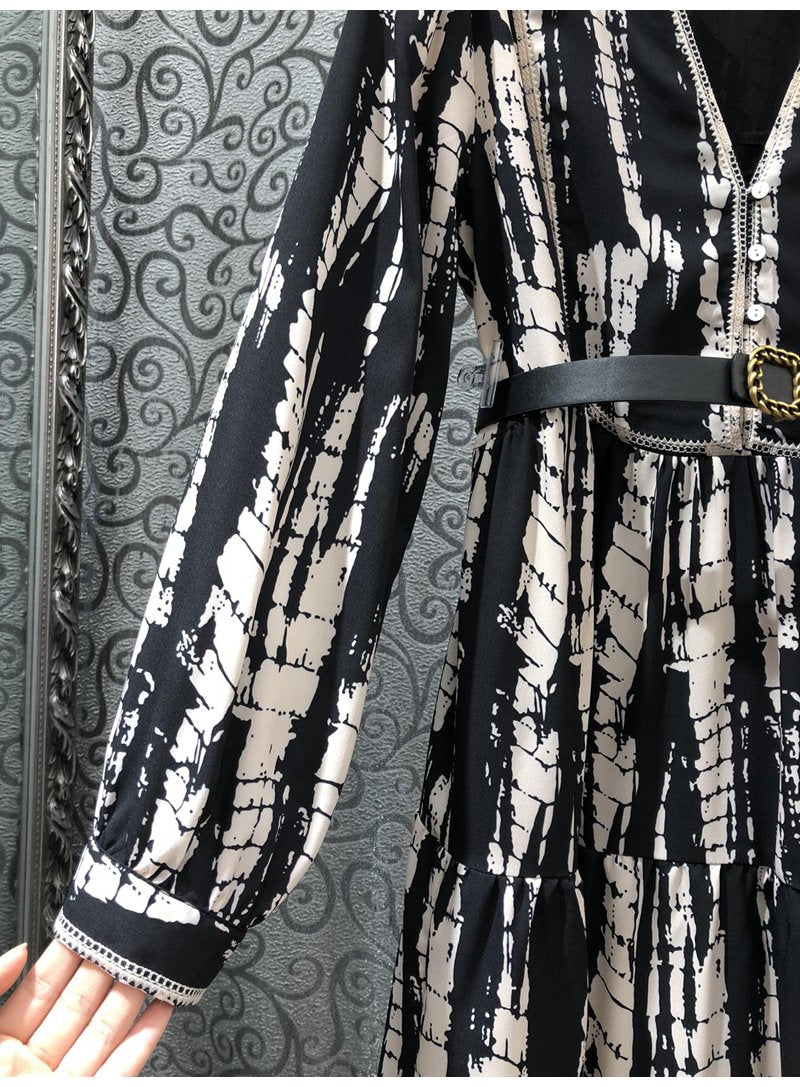 Wholesale Women Fashion Dress 2022 Autumn Clothing Ladies V-Neck Vintage Prints Belt Deco Long Sleeve Mid-Calf Length Dress