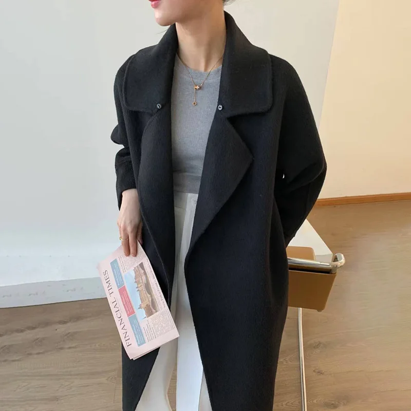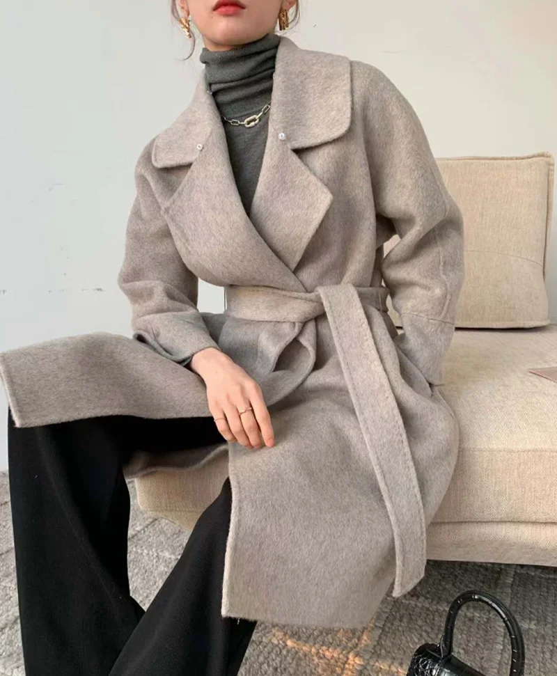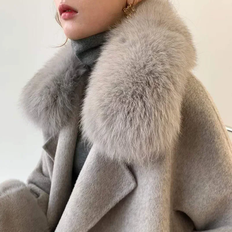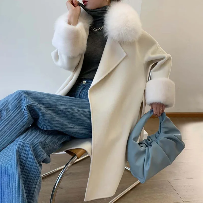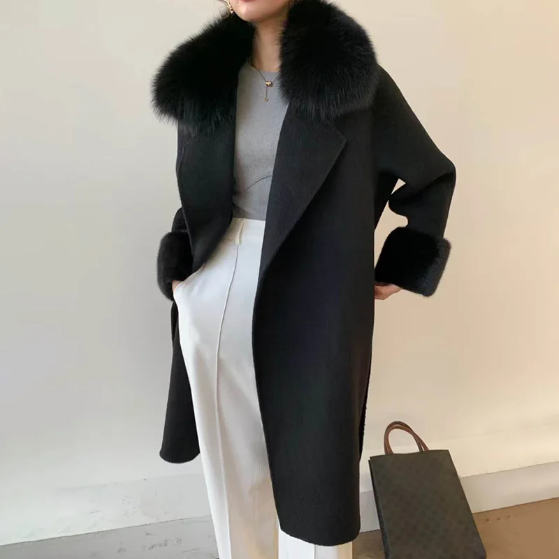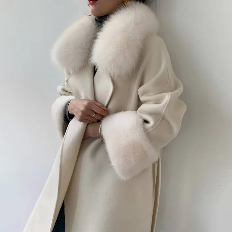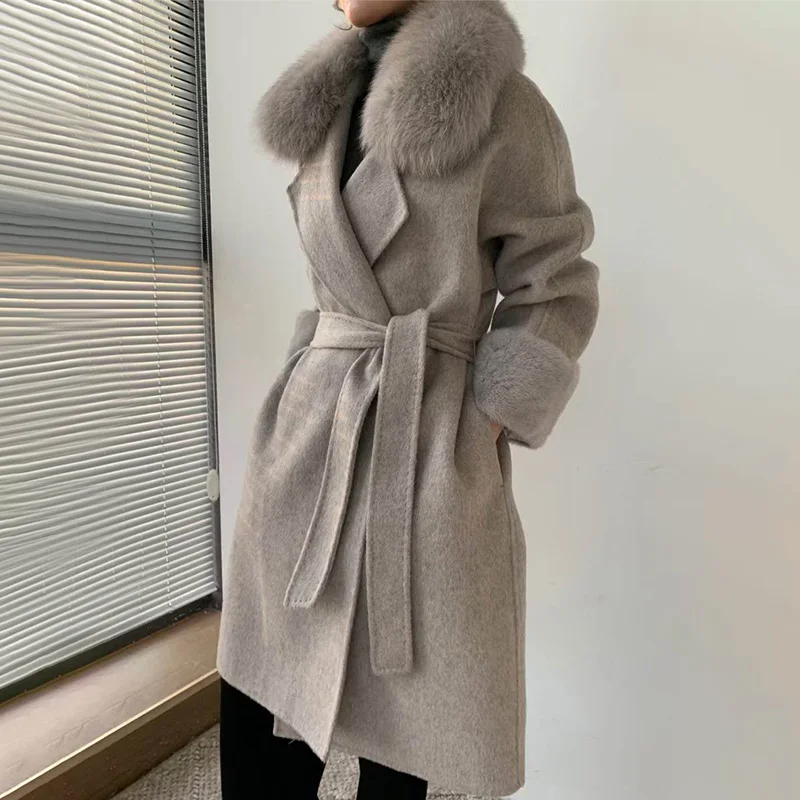 Windproof Belted Cashmere Coat Real Mink Fur Cuffs Long Wool Coat Women With Fox Fur Collar