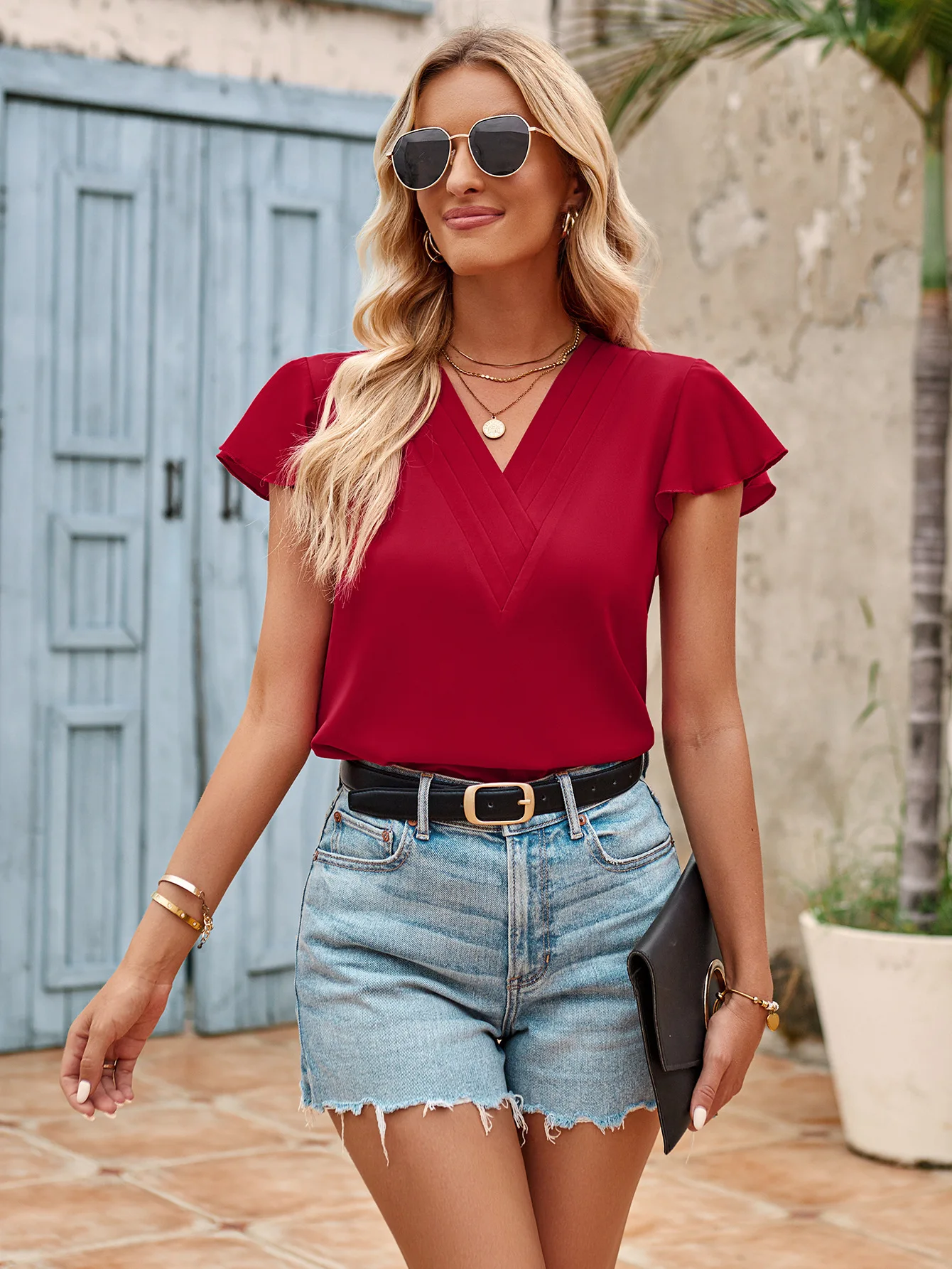 Women 2023 Summer Latest V Neck Ruffle Short Sleeve Loose Women's Dressy Chiffon Tops And Blouses