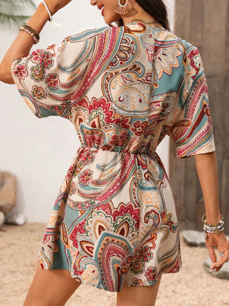 Women's Bohemian holiday style geometric print V-neck wide-leg trousers hidden meat non-bloated jumpsuit