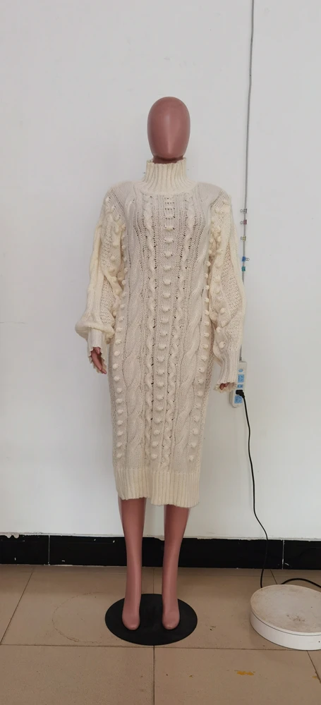 Womens Knitted Dresses High Neck Long Sleeve Sweater Dress with Split Ladies Vintage Knit Midi Dress Casual Fashion Winter