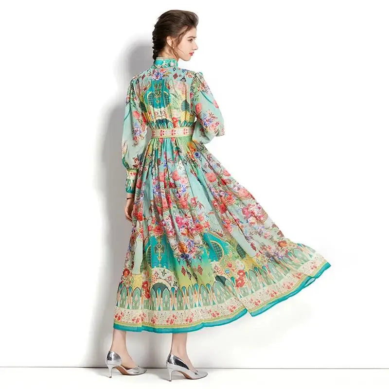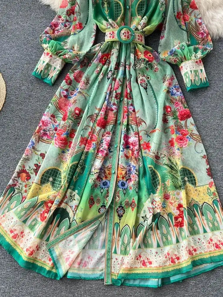 Women's Turtleneck Lantern Sleeve Single Breasted Flower Print Maxi Dress Autumn Bohemian Chiffon Green Belt Holiday Vestidos