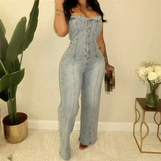 Womens Casual Classic Jumpsuit Off Shoulder Strapless Vintage Denim Long Pants High Street Jumpsuit Women