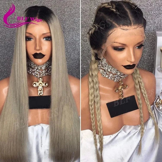 Straight Hair Full Lace Wigs Ombre Ash Blond Remy Brazilian Human Hair Wig Lace Front Box Braid Wig