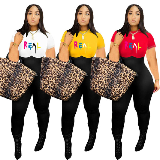Z107068 Sexy short sleeve Letter Print Pocket Jumpsuits Women V Neck Casual Plus Size Rompers