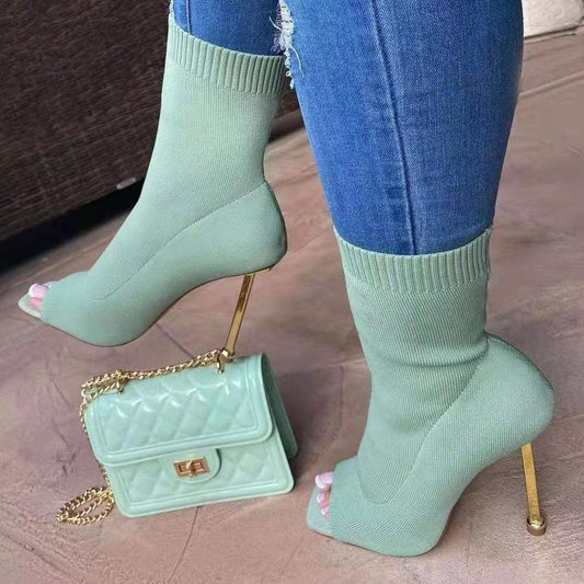 Spring New Fashion Knitted Ladies Stiletto High Heel Boots Women Open Toe Sock Ankle Heeled Shoes Sexy Boots Red and Green