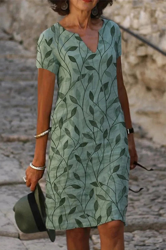 Flycurvy Plus Size Casual Green Cotton And Linen Leaf Print Split Neck Midi Dress