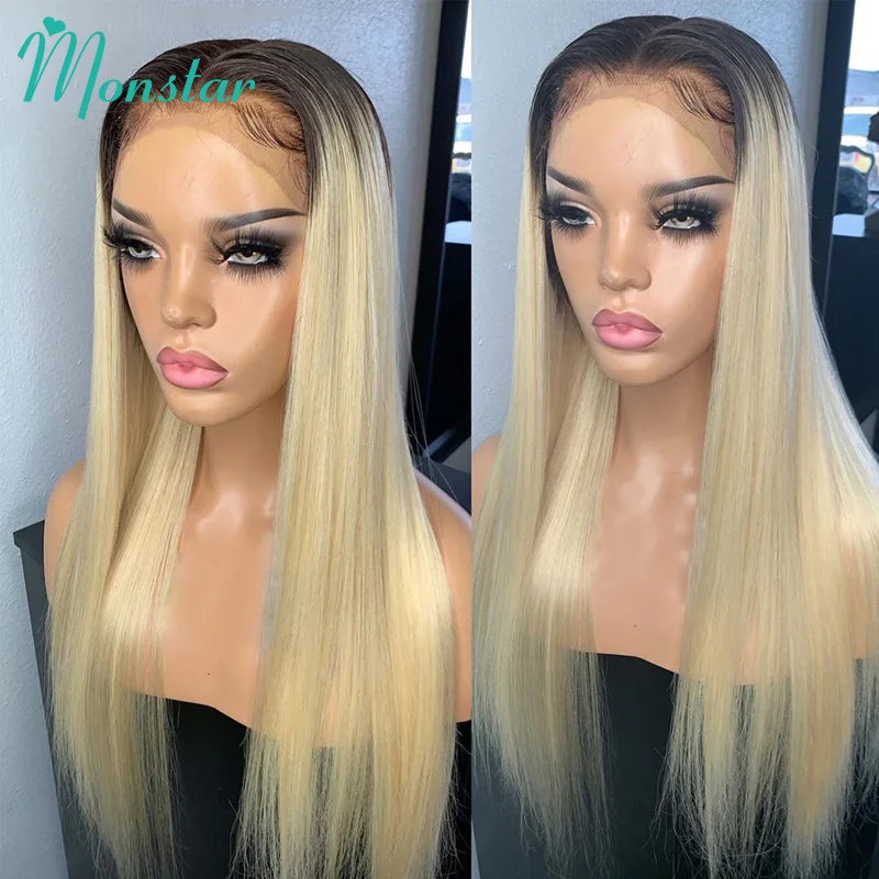 13x6 Lace Frontal Wig Brazilian Straight Full Lace Human Hair Wig 2 Tone Dark Root 1B 613 Ombre Blonde Lace Front Wigs for Women