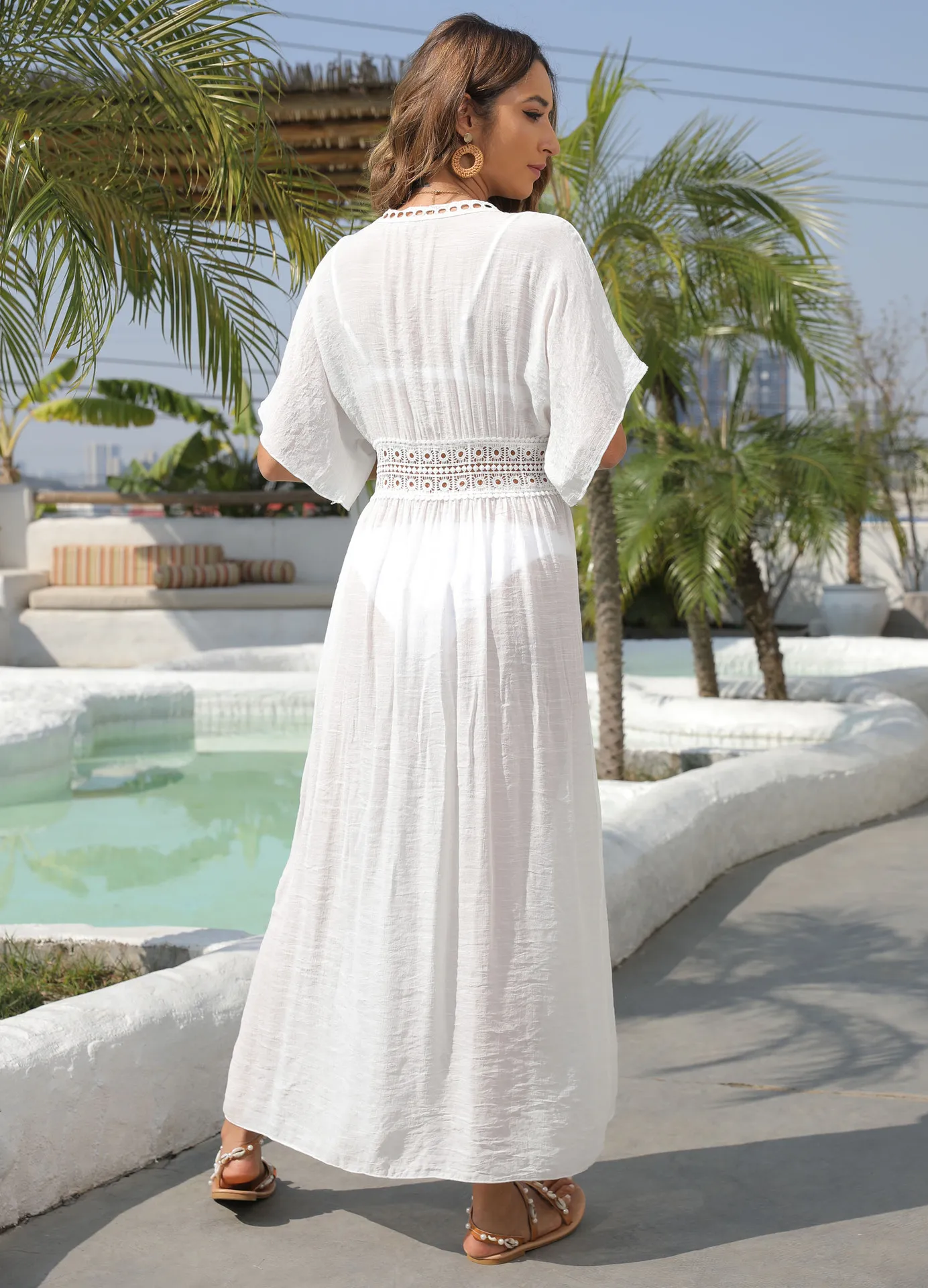 2024 Bohemian Bikini Cover-ups Retro Self Belted Women Long Kimono Dress Beach Wear Lace contrast Cover Up Manufacturer