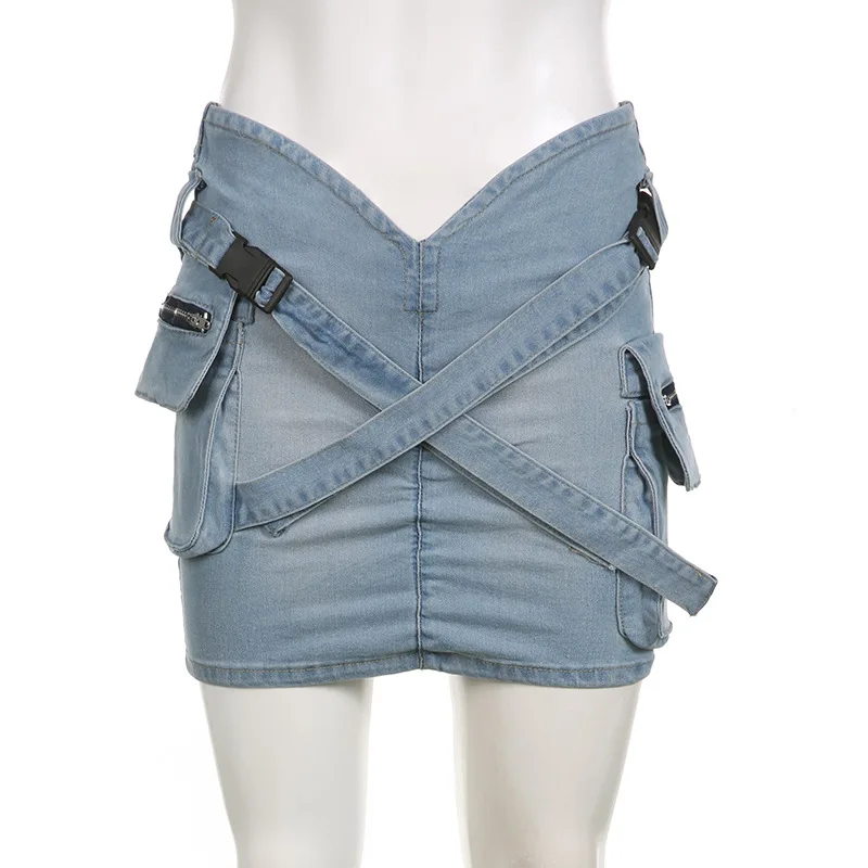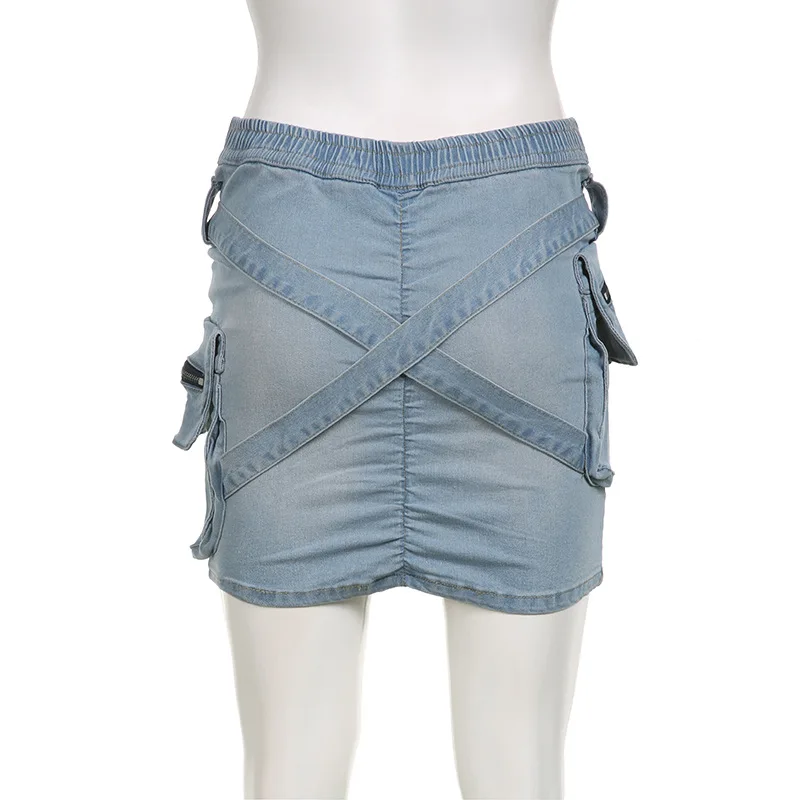 2024 New Arrivals Cross Belt Denim Skirt High Waist Casual Skirt Fashion Zip Pocket Mini Skirt For Women