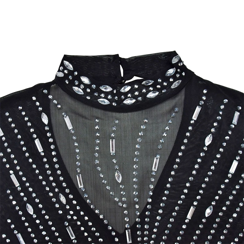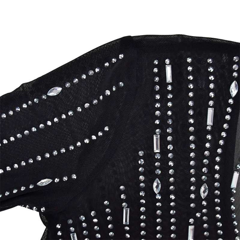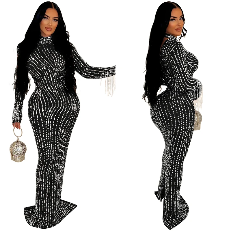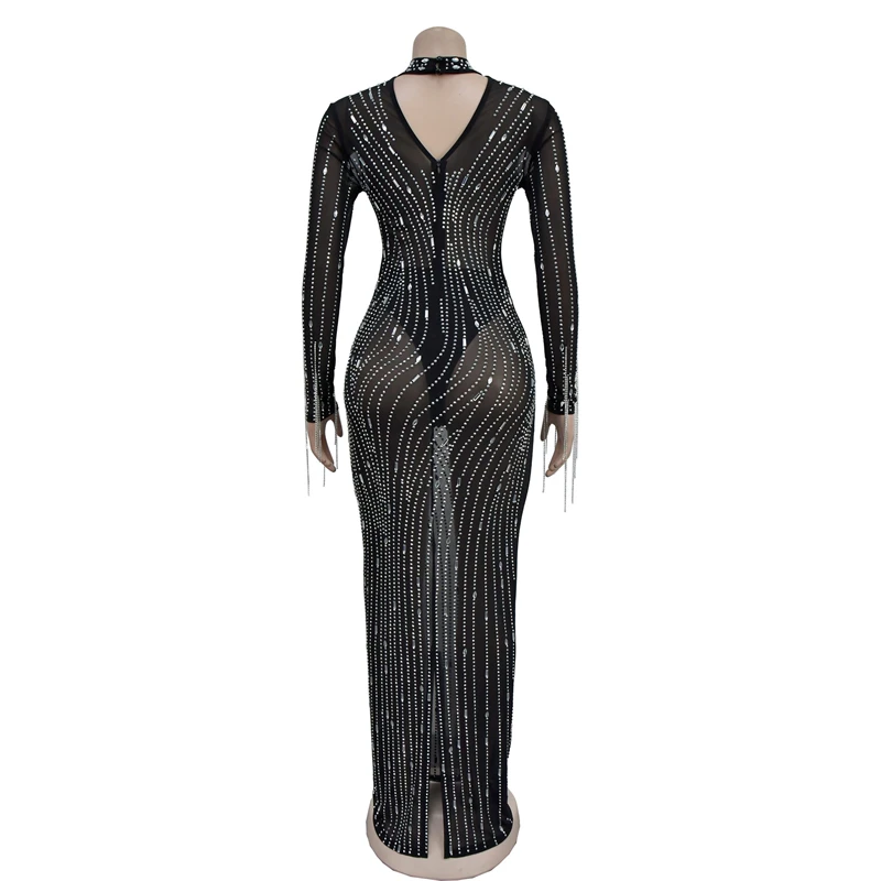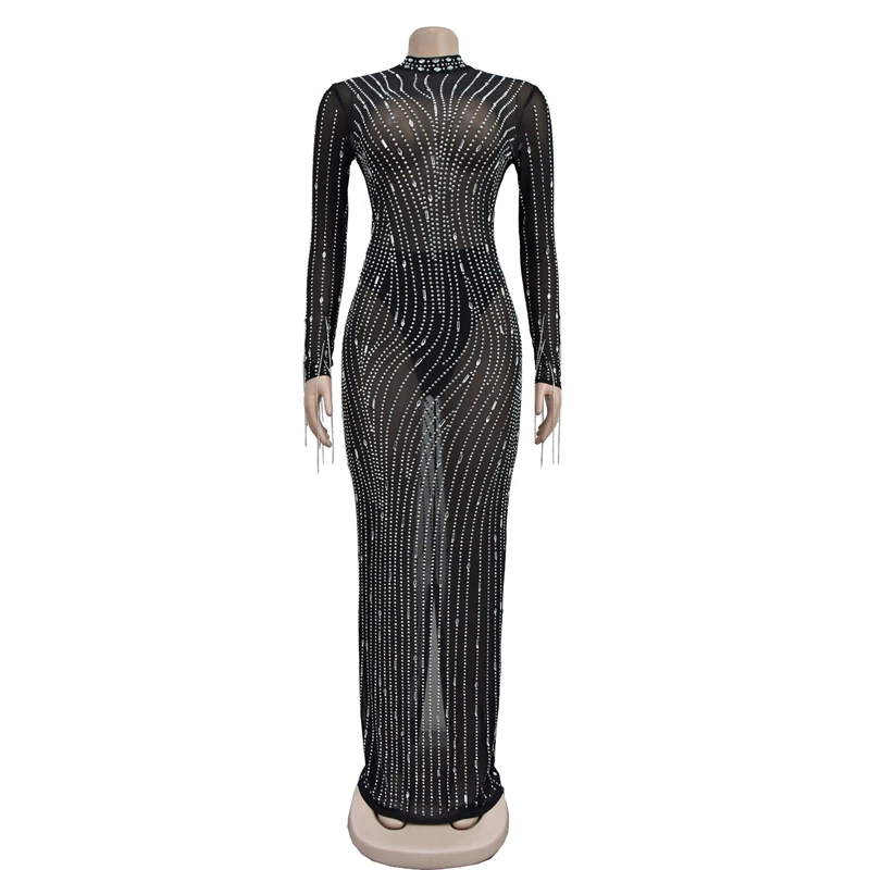 2024 women lady mesh sheer sexy long sleeve heavy beaded rhinestone crystal appliqued maxi long Evening gown Dress with glitter