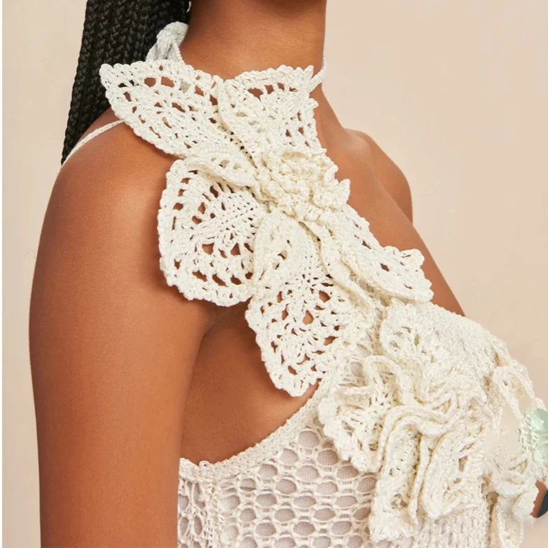 2025 New Summer Dress Fashion Flower Knit Hollow Out Dress Sexy Vintage Solid Slim Sleeveless Backless Women Dresses Mini Dress