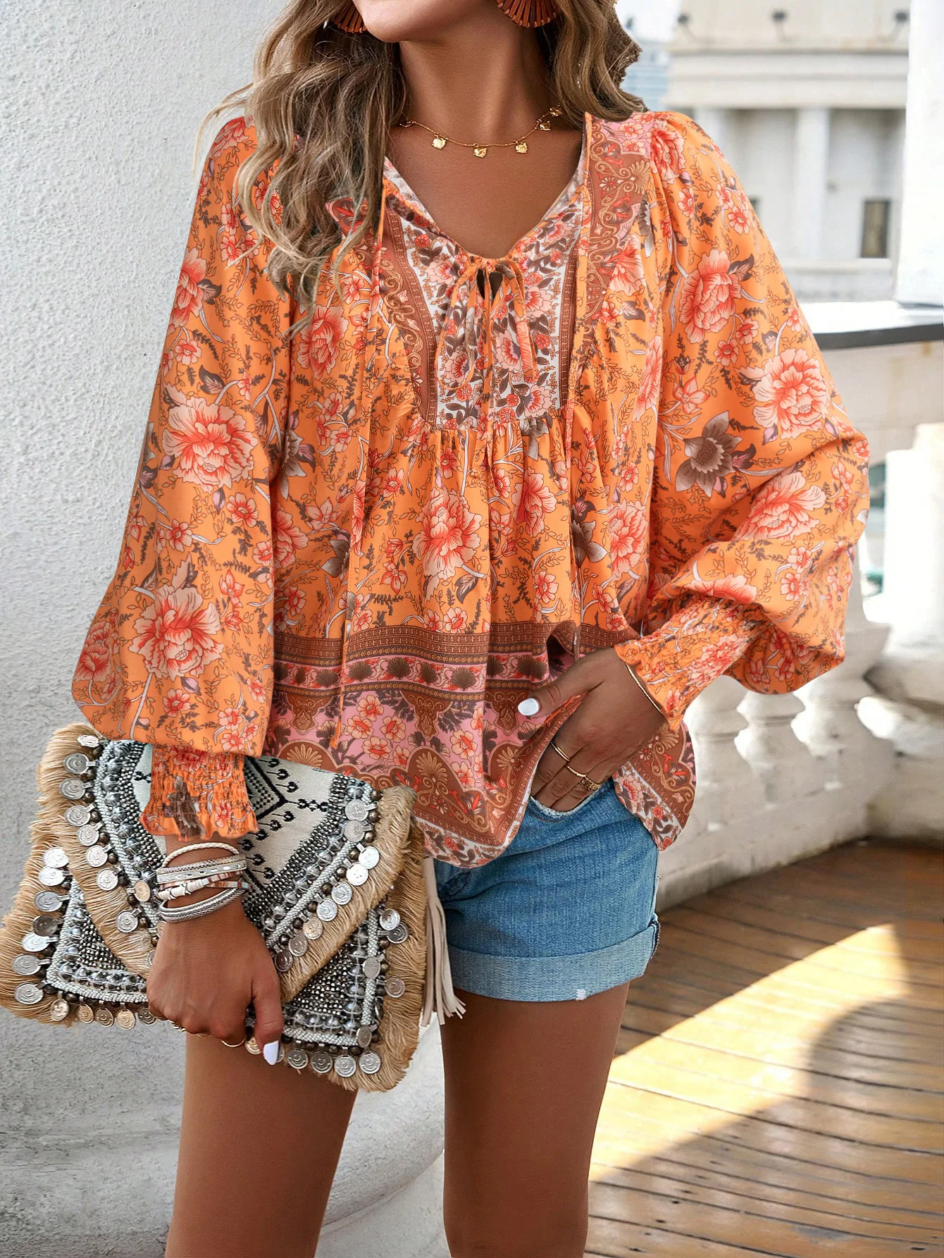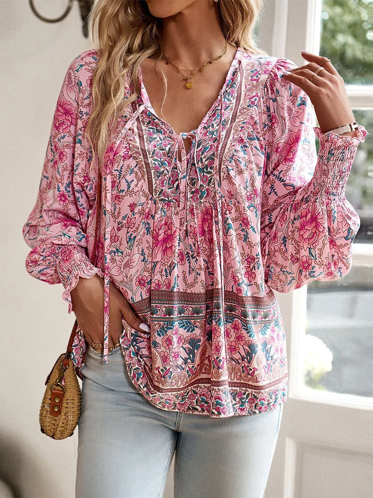 2025 Spring Summer Printed Shirt Women Elegant Chiffon V-neck Long-sleeve Top