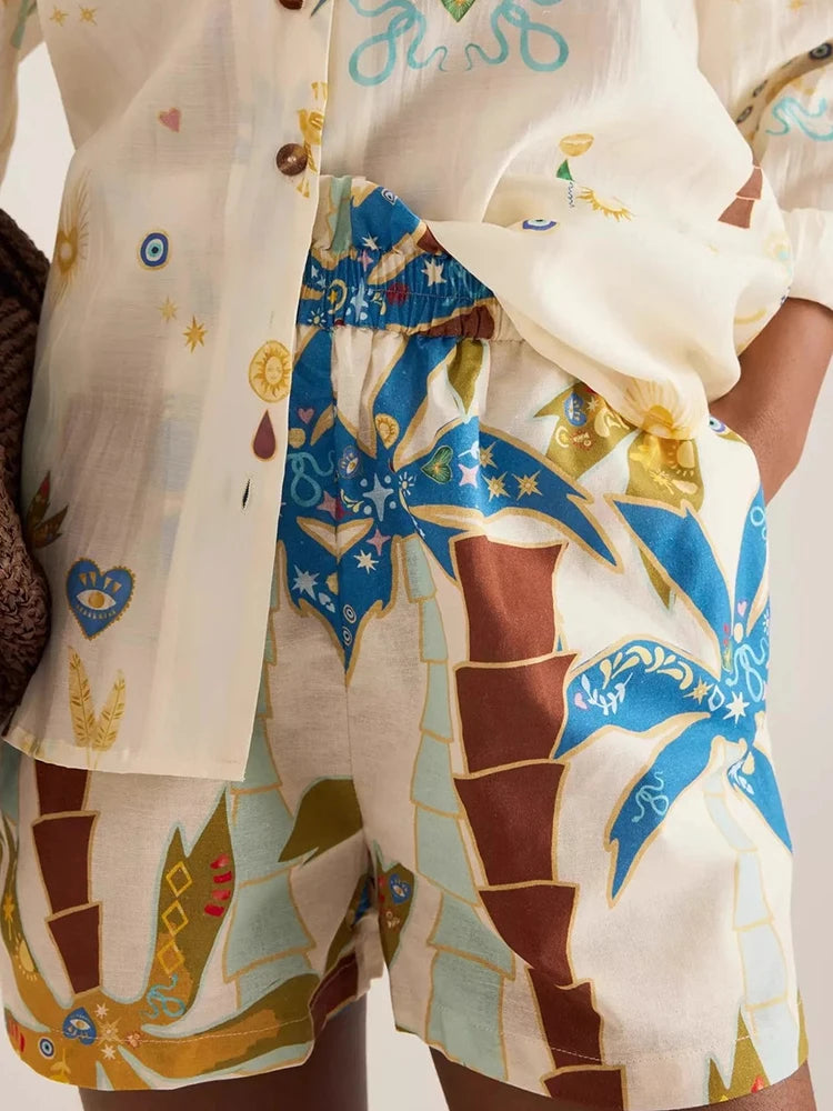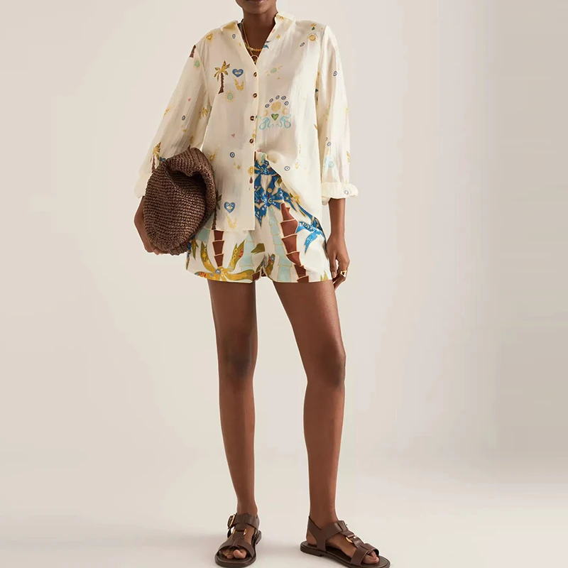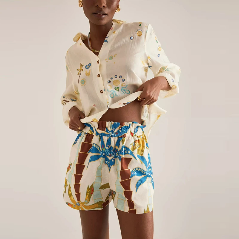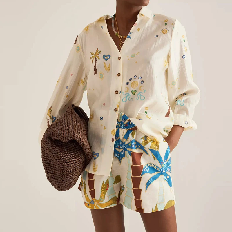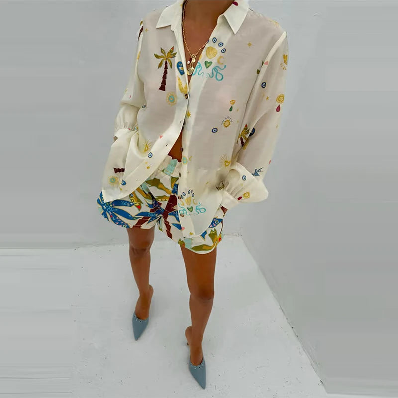 2025 Vacation Loose Outfit Spring Summer Pattern Printed Long Sleeved Two Piece Set Women Lapel Button Up Shirt and Shorts Suit