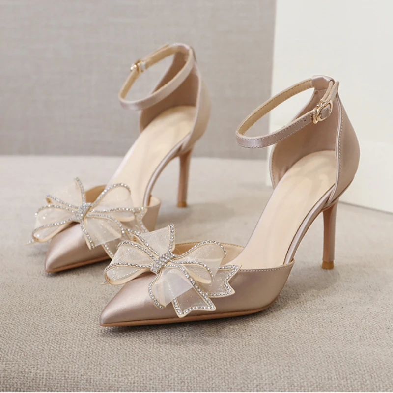 6CM/8CM Size 31-43 New Arrival Fancy Bow Rhinestone Buckle Strap Pointed Toe Heels for Ladies