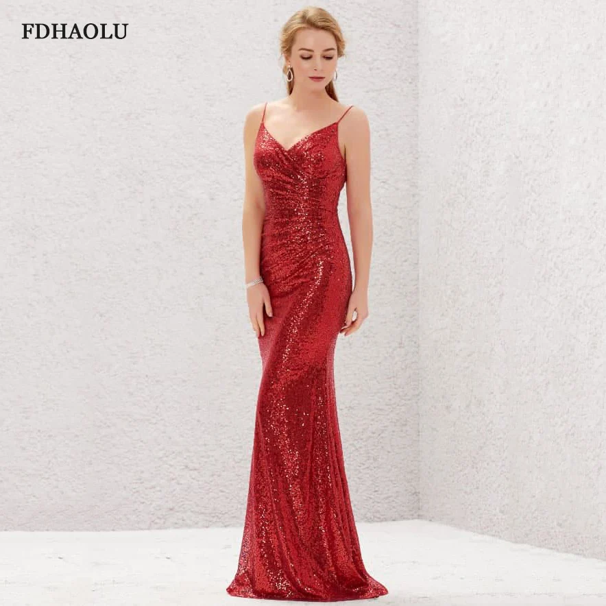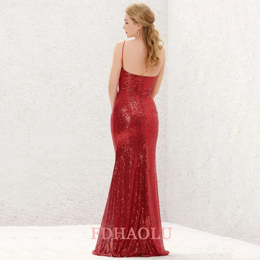 AE128 V-Neck Red Sexy Formal Party Gown Dubai Luxury Sleeveless Full Sequined Cocktail Evening Dress Customized