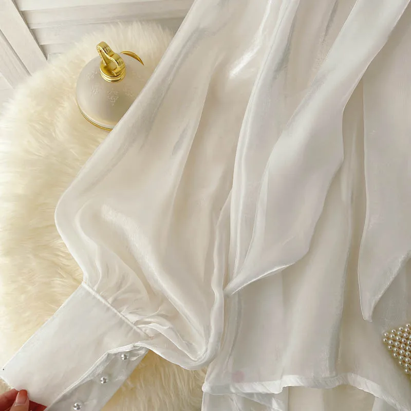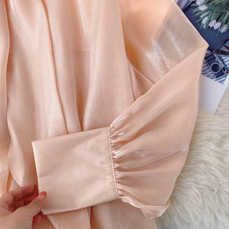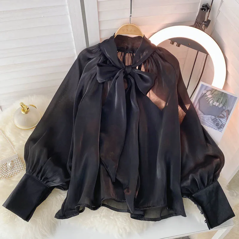 ANSZKTN Spring Fall New France Bow Celebrities Loose Sweet Lace Puff Sleeve Top For Women