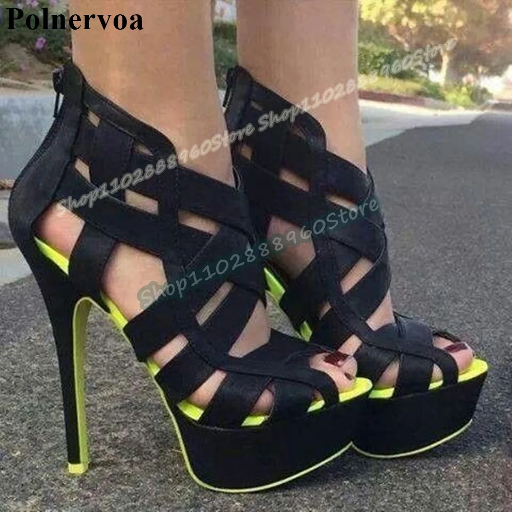 Black Cross Strap Pink Sole Platform Sandals Stilettos High Heel Shoes For Women Back Zipper Peep Toe Casual Party Sandals