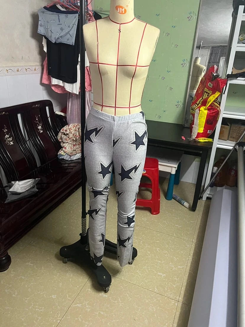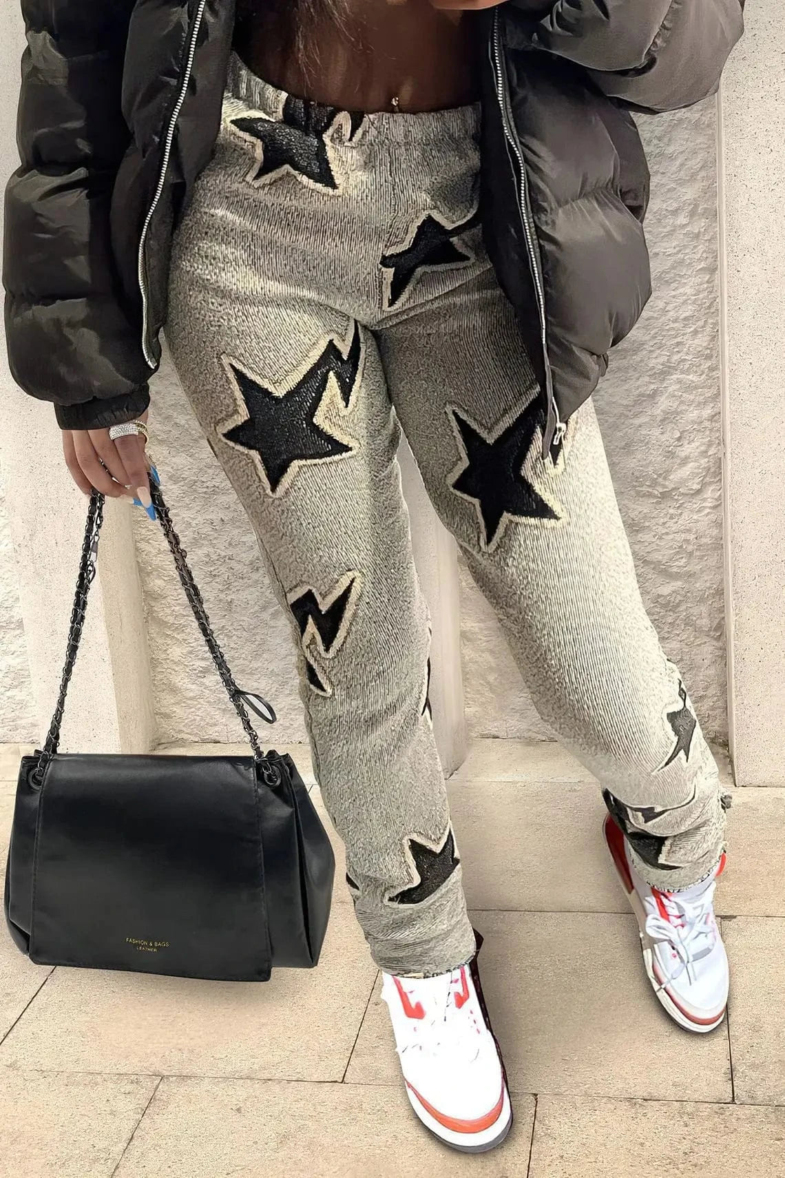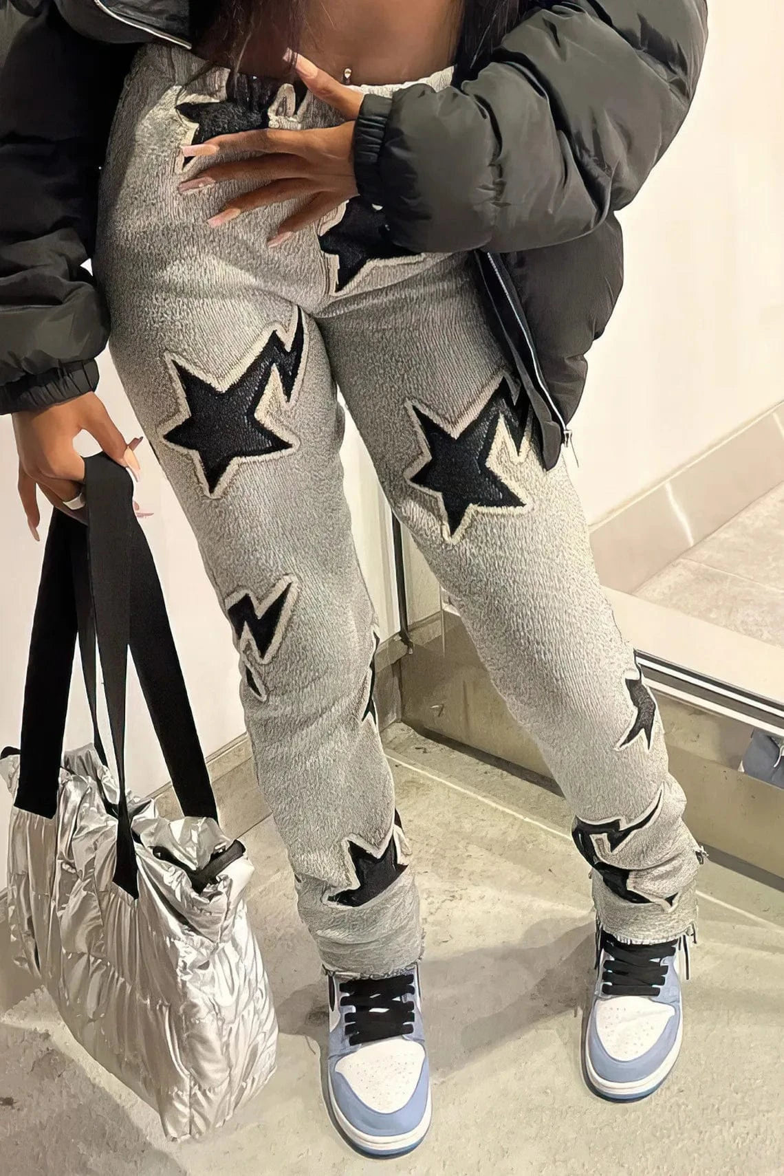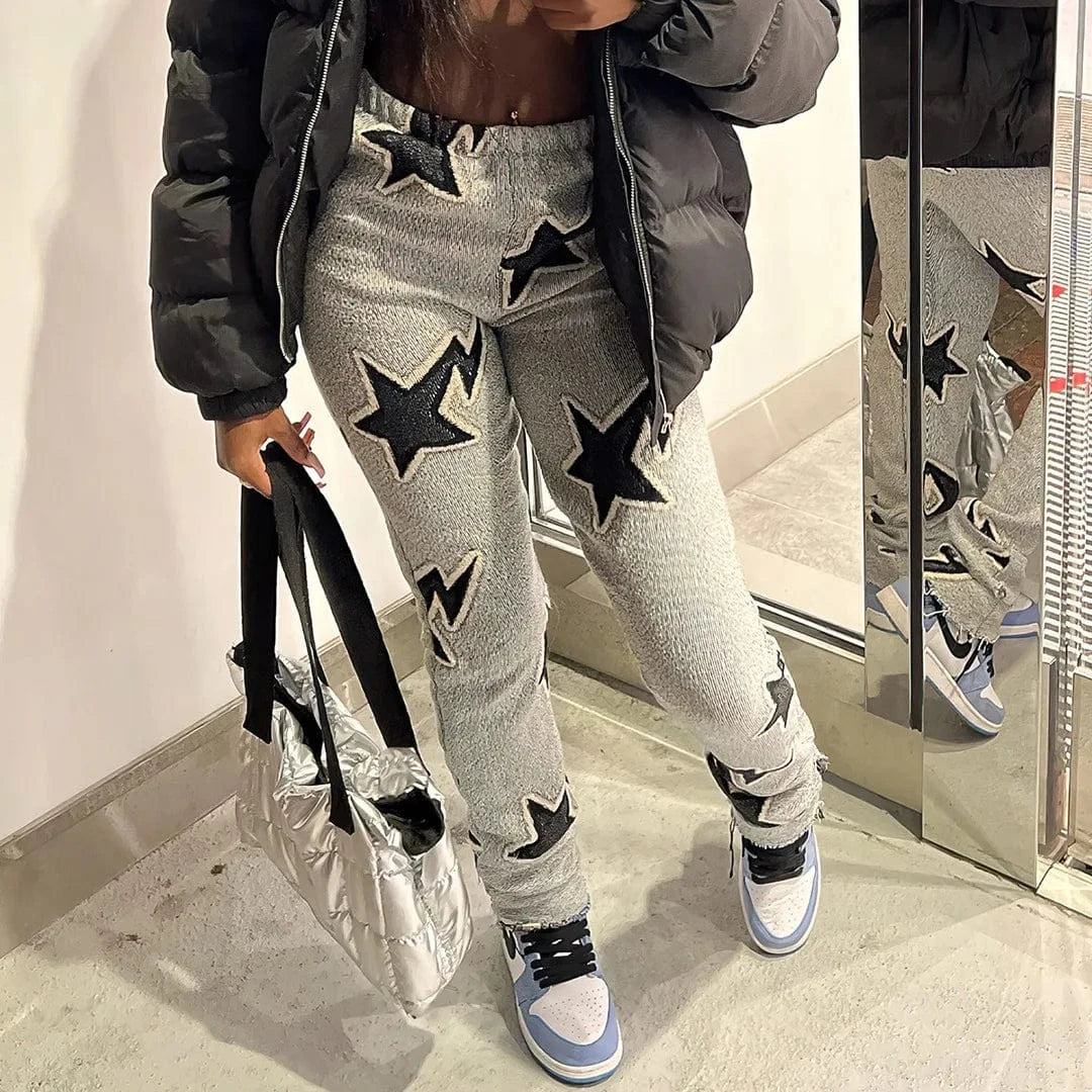 Bomblook ASPT121 Star Emboss Print Sanding Stack Pants Women High Waist Pants Winter Pants Women