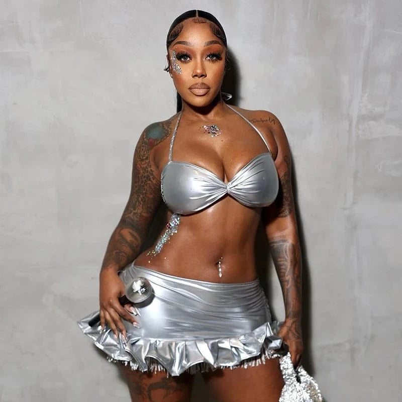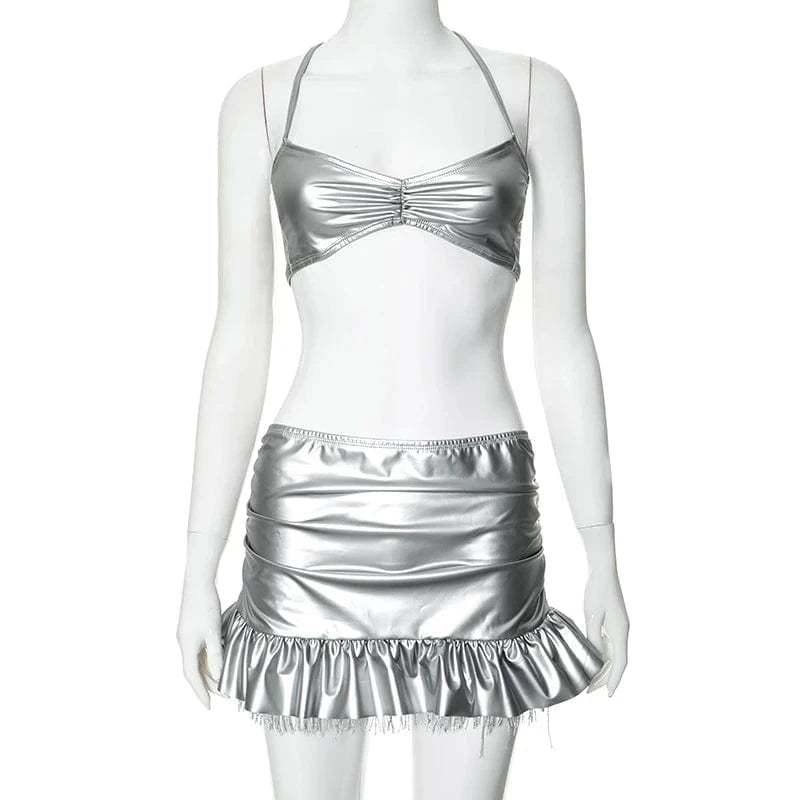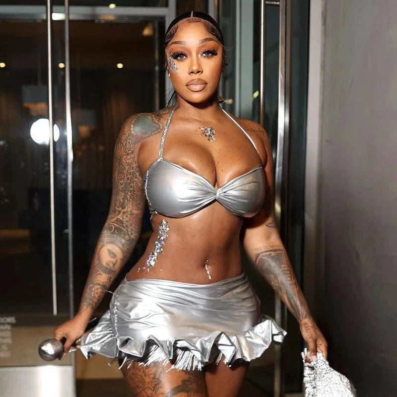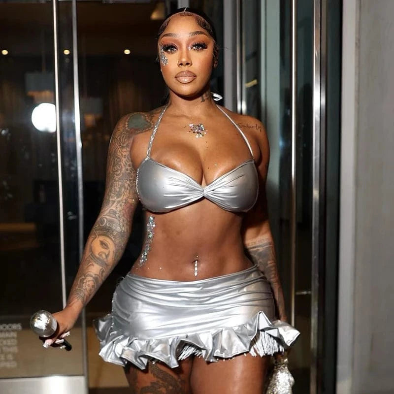 Bomblook K24ST159 Party Club Wear Halter Top Mini Skirt With Tassels PU Leather Tweed Set 2 Pieces Suit Women Solid Sets