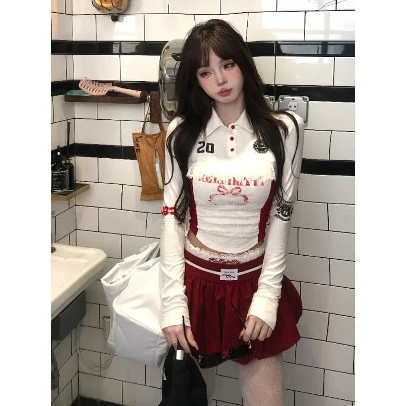 Bomblook Z923ST06 Sweet Patchwork 2 Piece Skirt Sets Women Sexy Lace Longsleeve T Shirt and Mini Bubble Skirt Set Mini Set