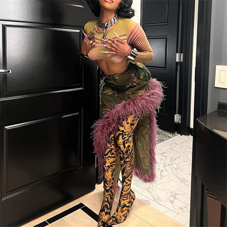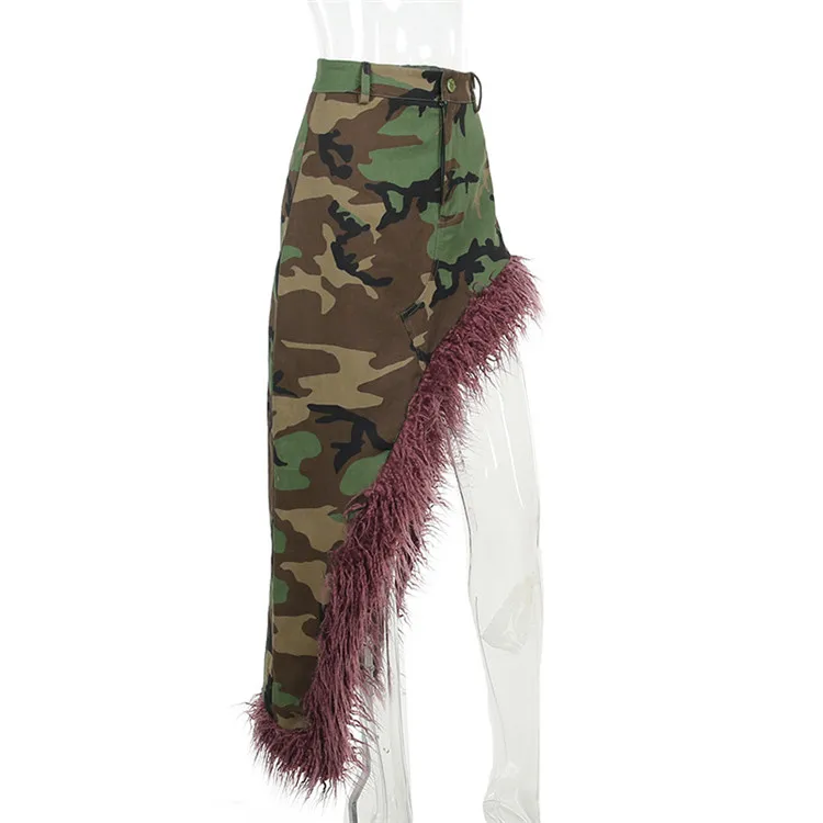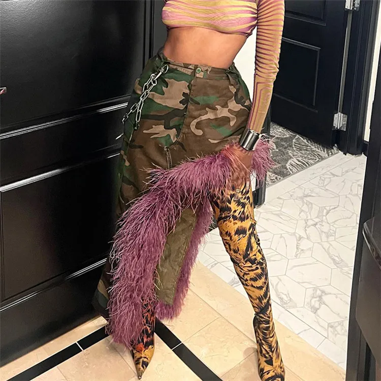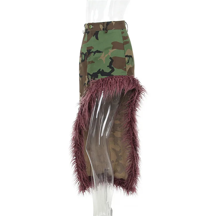 Camouflage Print Patchwork Fur Maxi Skirts Women Fashion High Waist Split Bodycon Skirt 2024