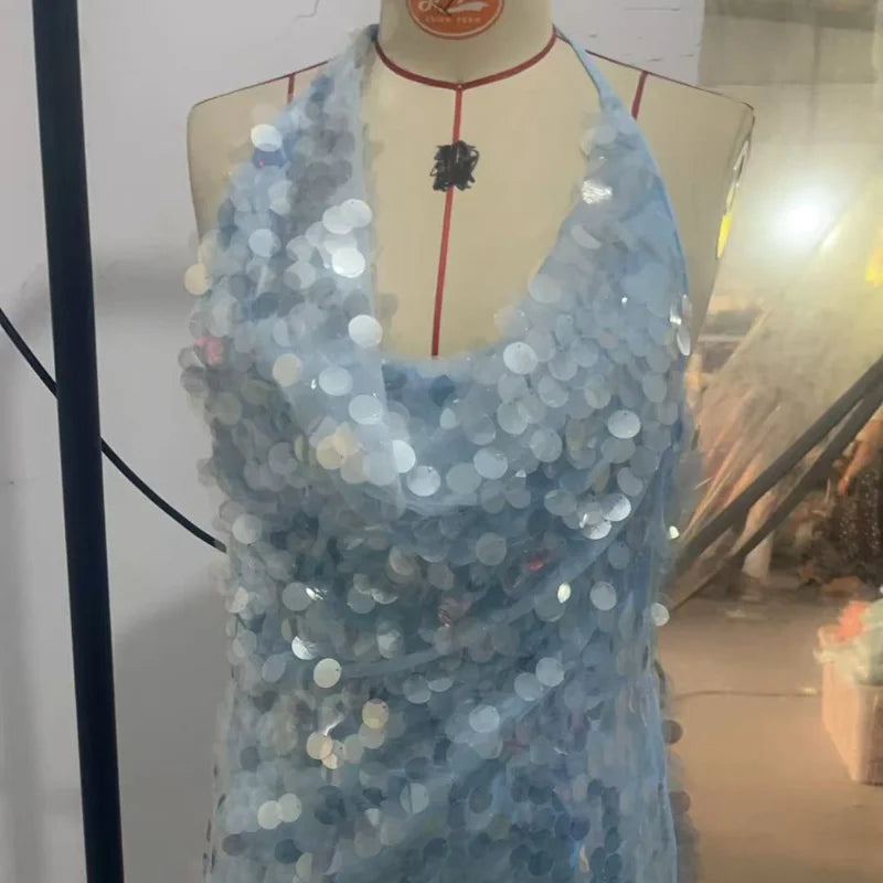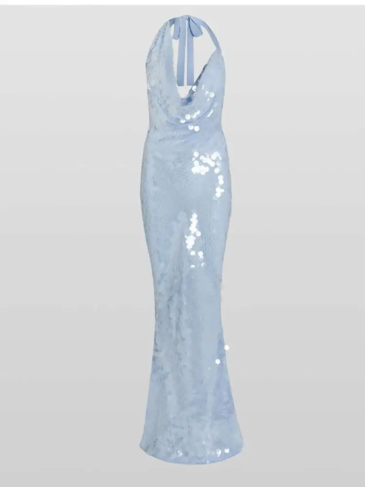 Chic Sequin Skinny Maxi Dress Swing Collar Backless Off Shoulder Lace Up Sparkling Vestidos For Women 2025 Summer Lady Y2k Robes